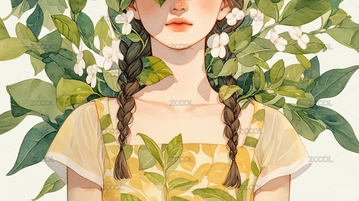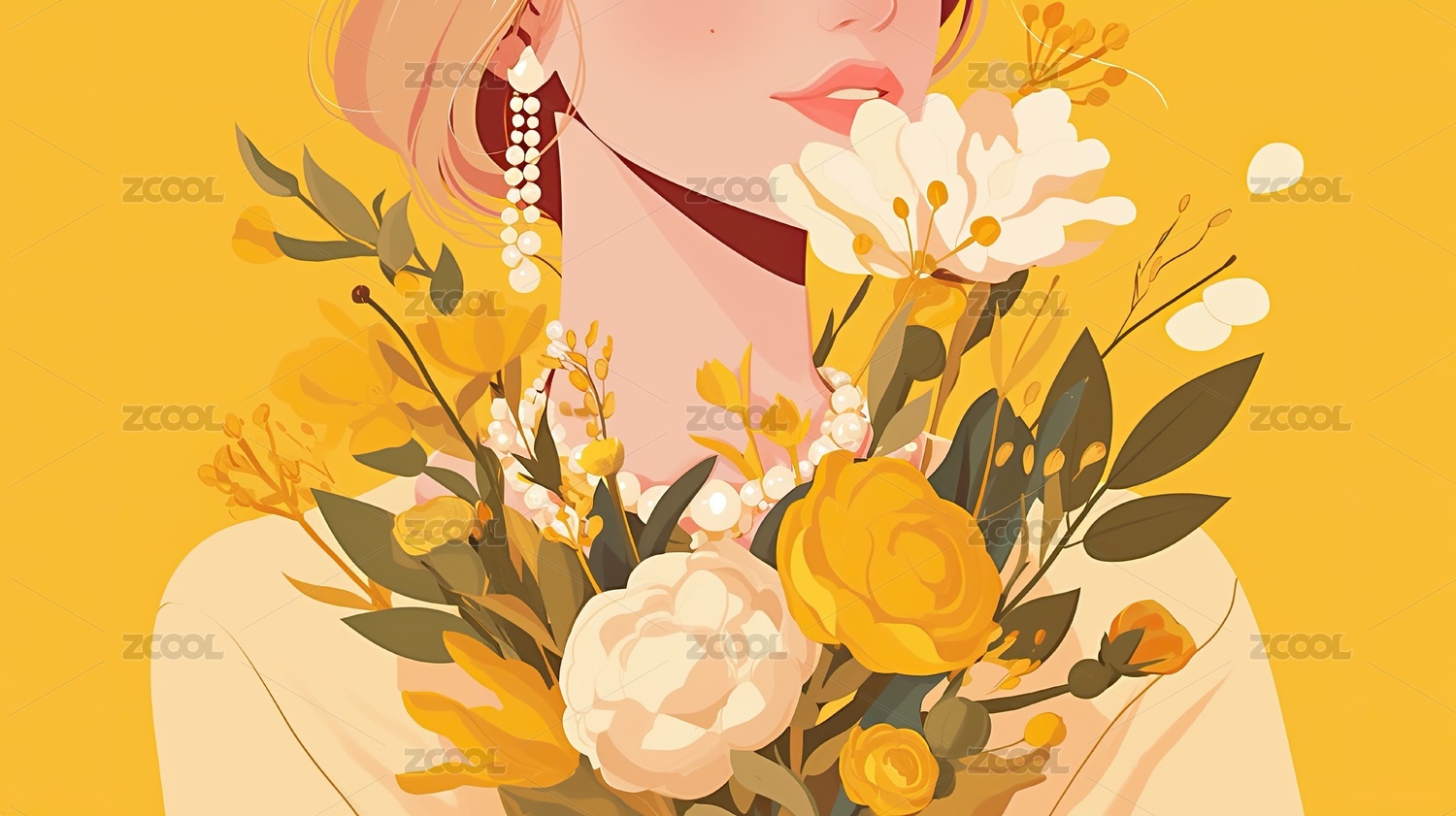 白底头戴鲜花的女孩女性人物头像插画绘画