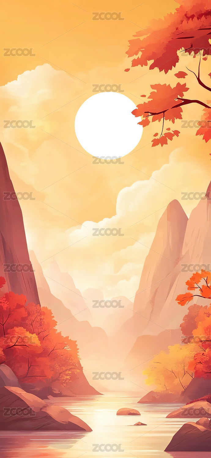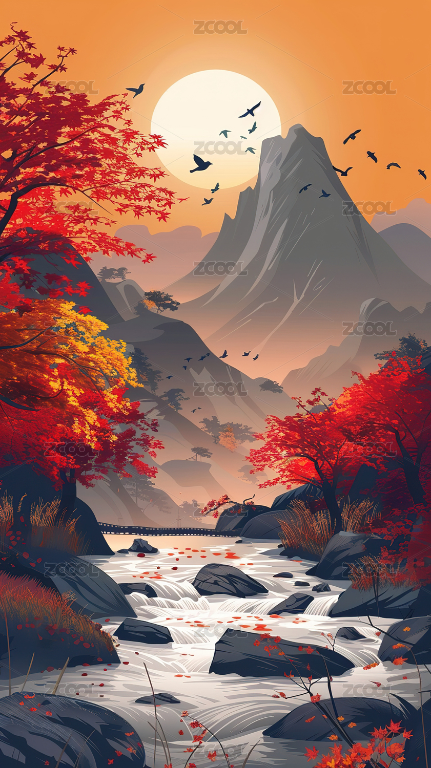 AIGC202402,中国风,秋天,季节,立秋,秋分,山水,风景,插画,绘画