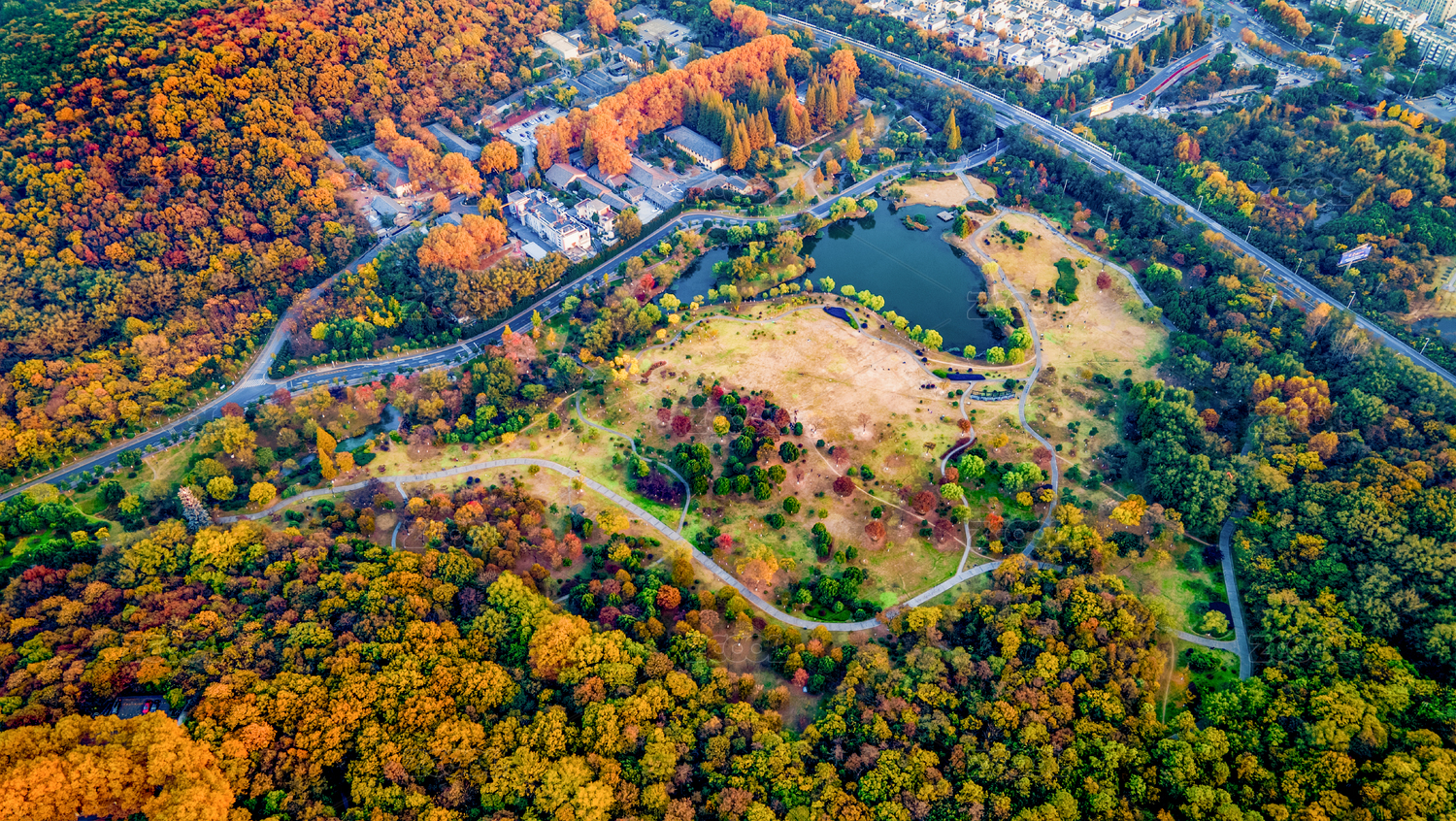 航拍南京紫金山下燕雀湖岸边的红色水杉