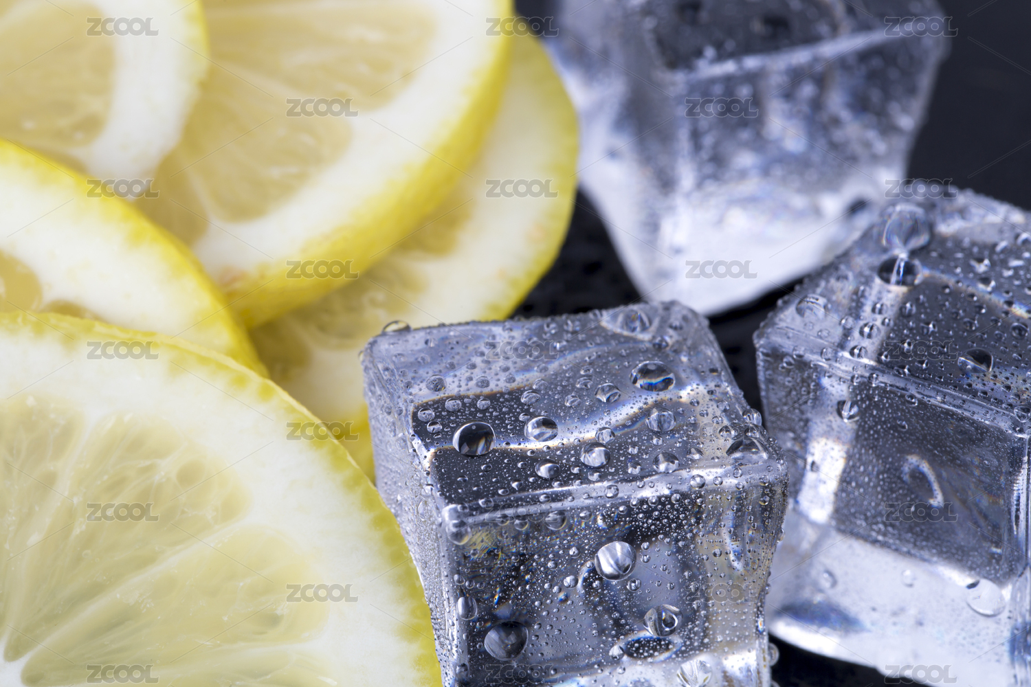 黑色背景上的一堆碎冰块和柠檬片美食餐饮背