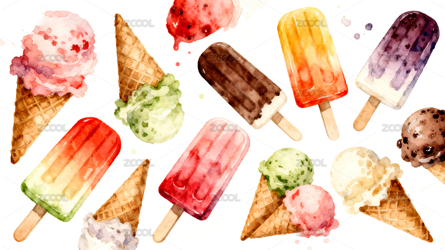 水彩风格的冰淇淋和冰棒