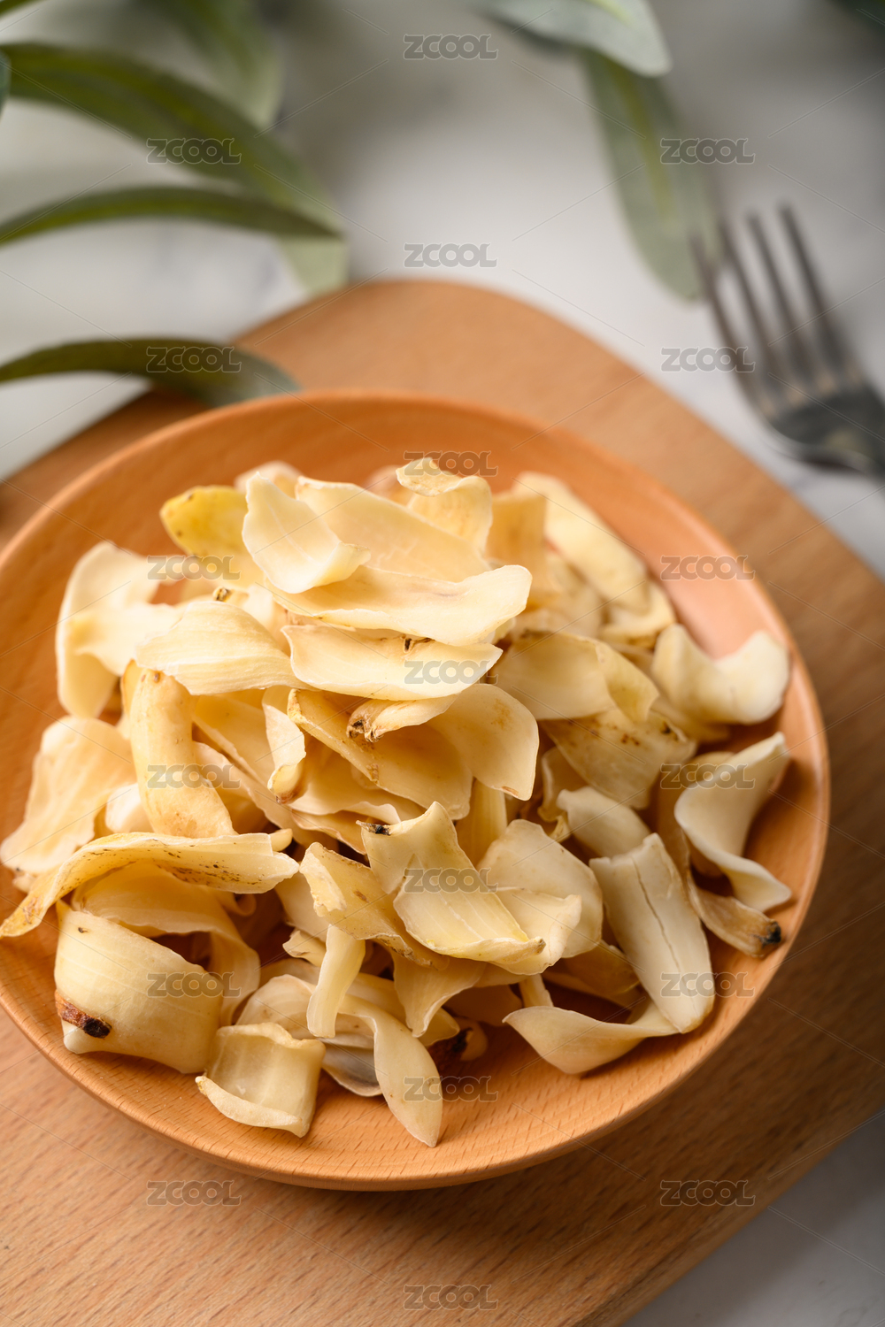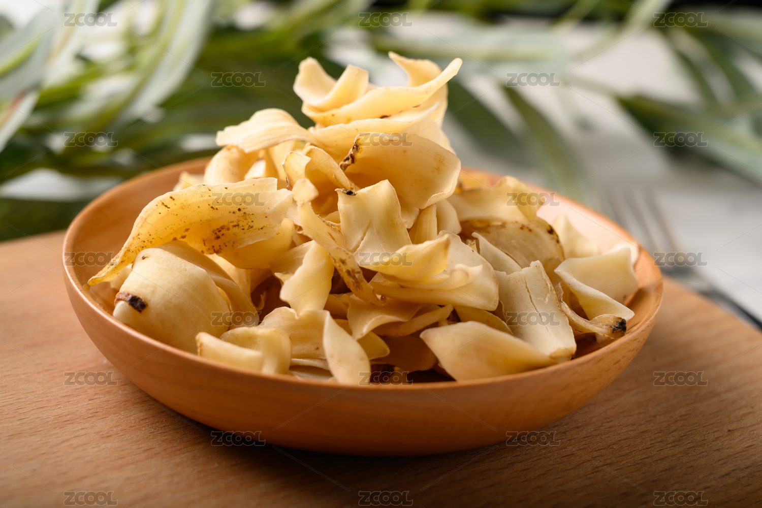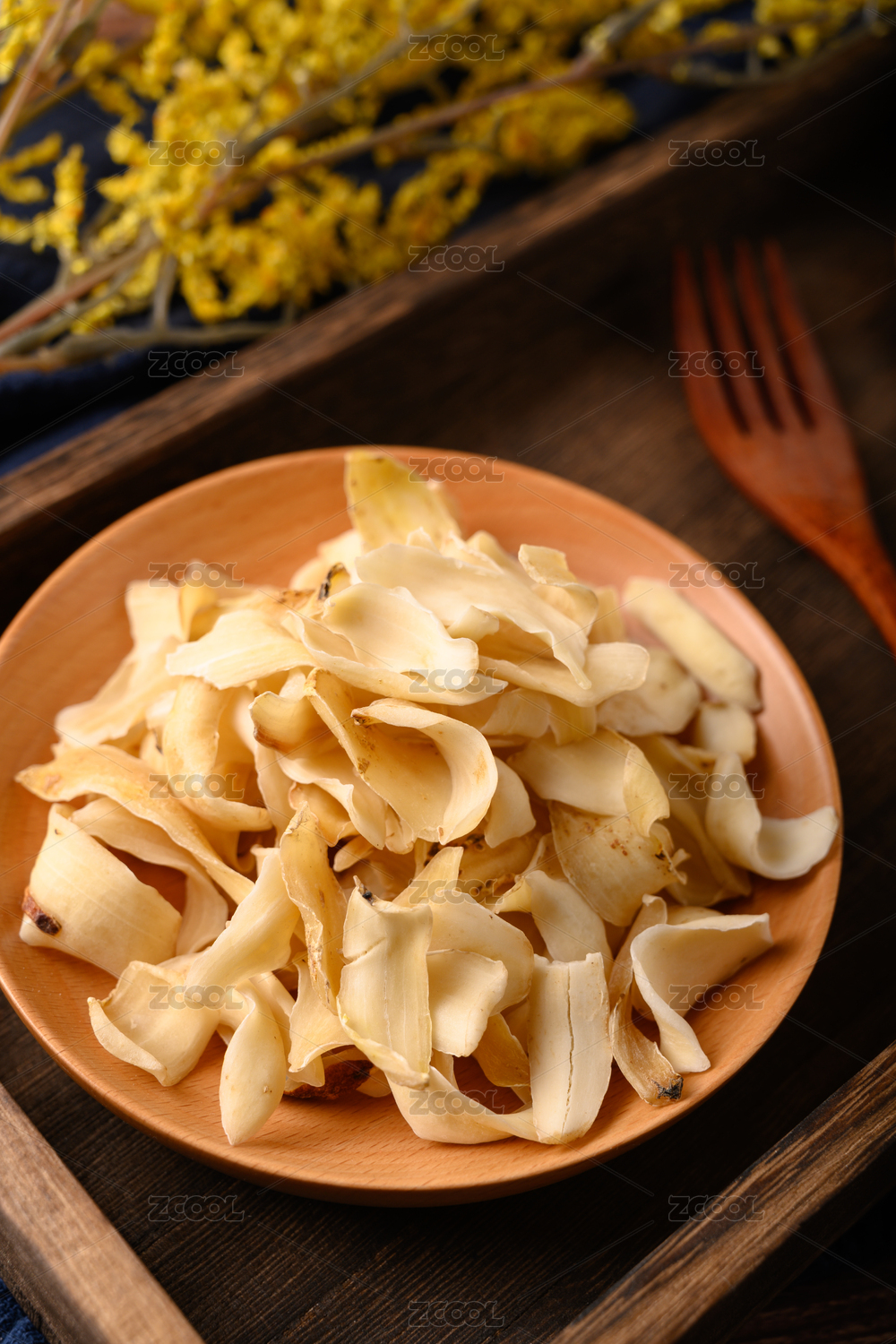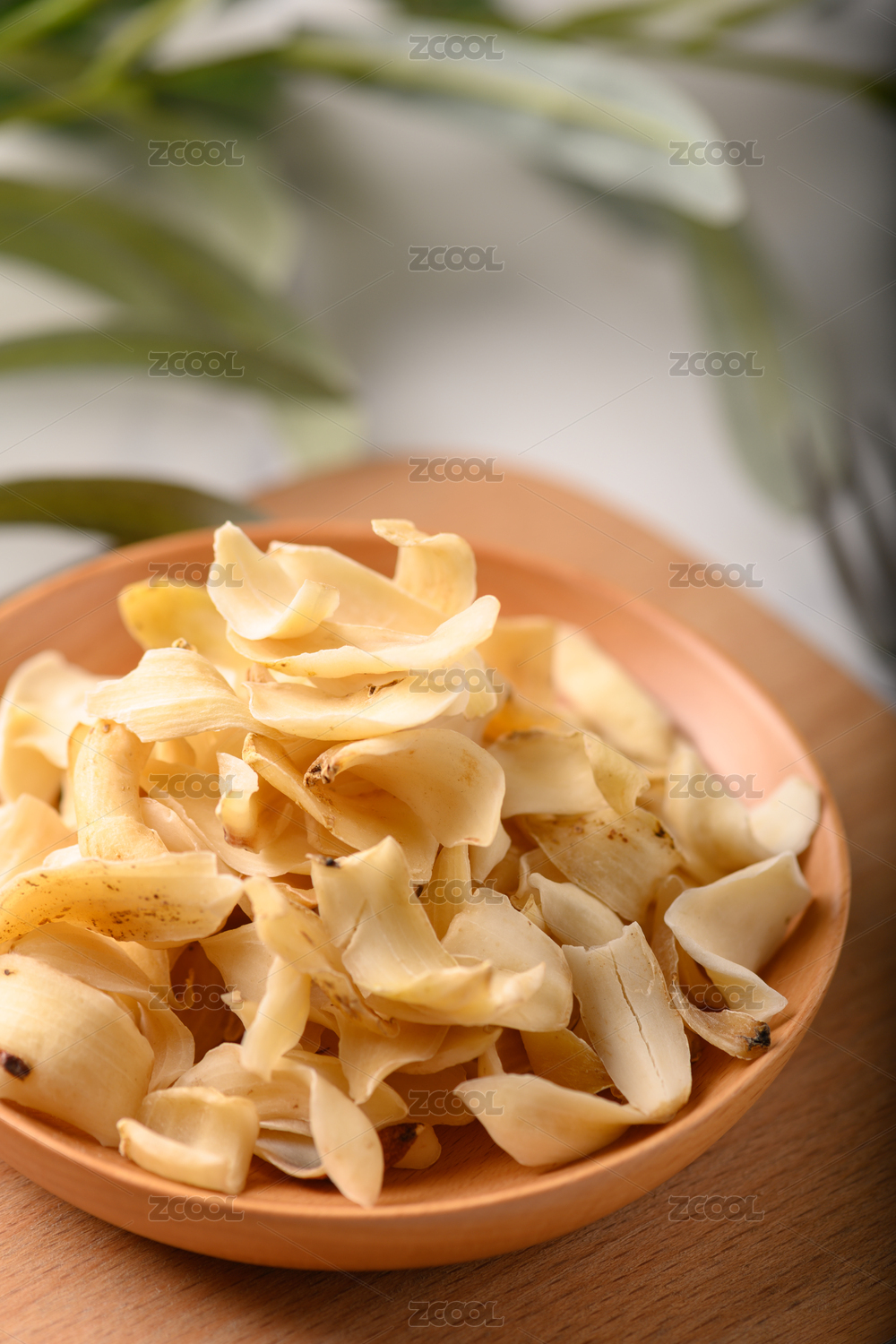 桌面上的盘子里的美味干爽的百合干