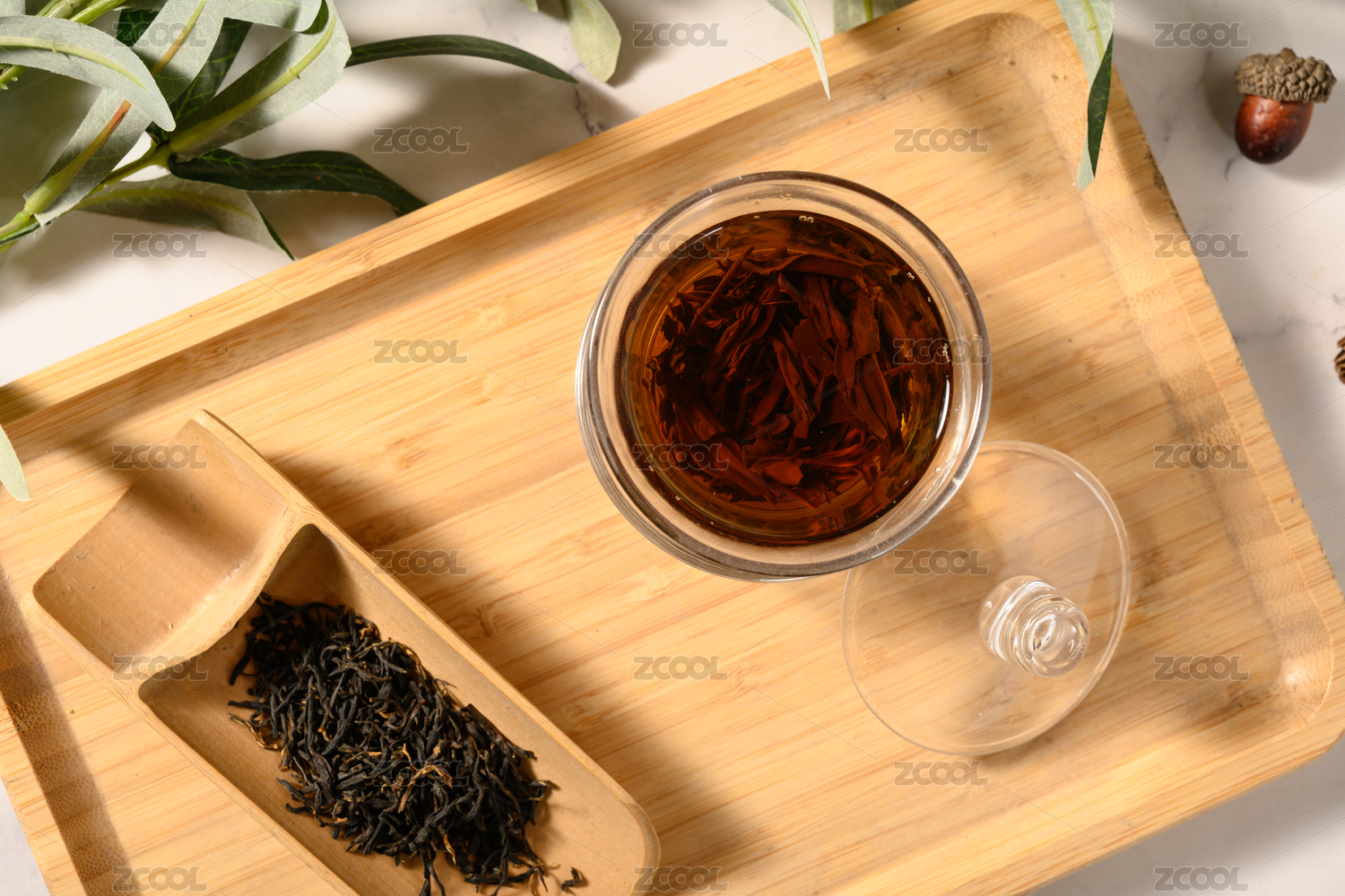 桌面上的竹盘子里的金骏眉和玻璃杯里的红茶