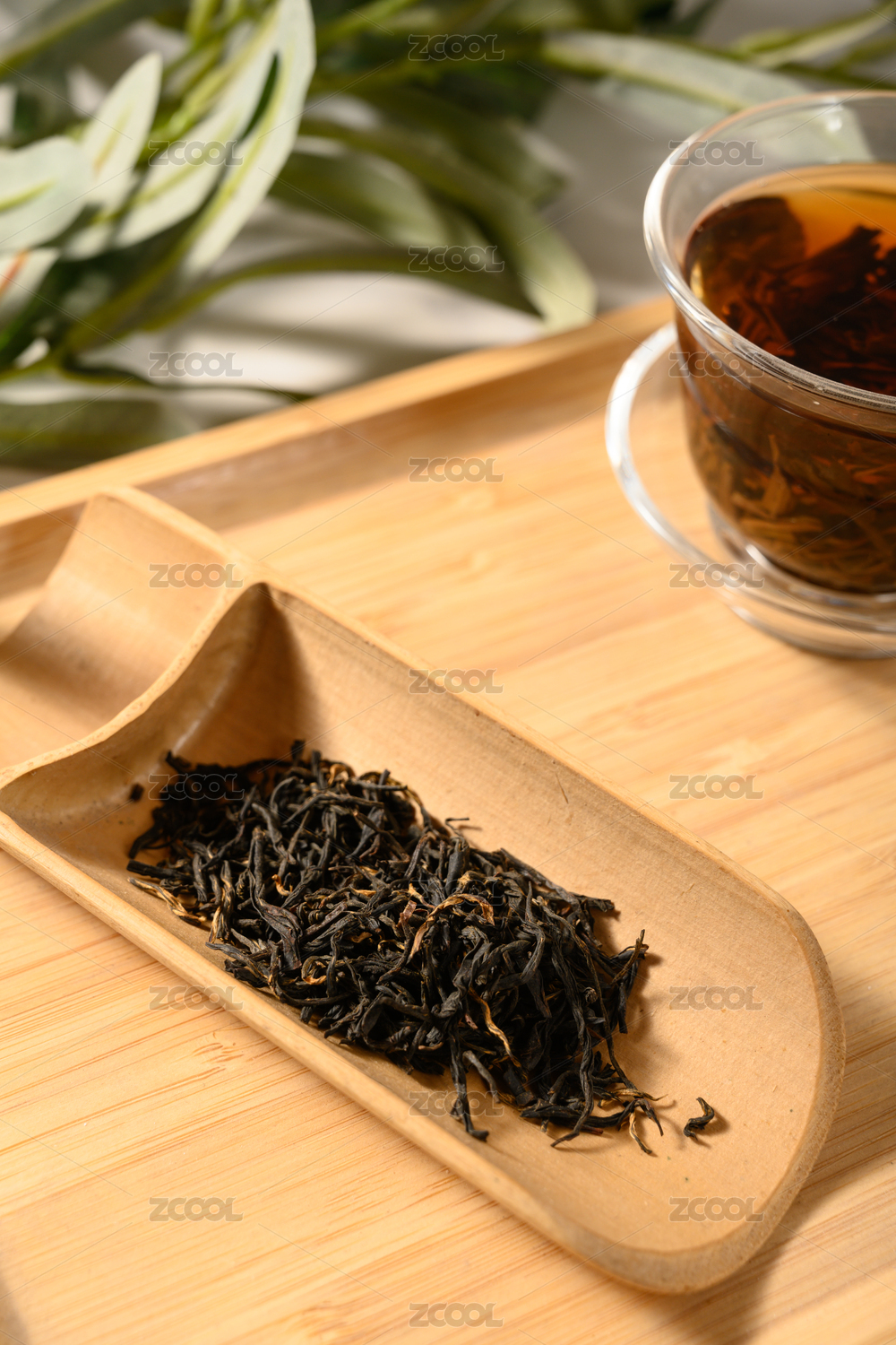 桌面上的竹盘子里的金骏眉红茶茶叶