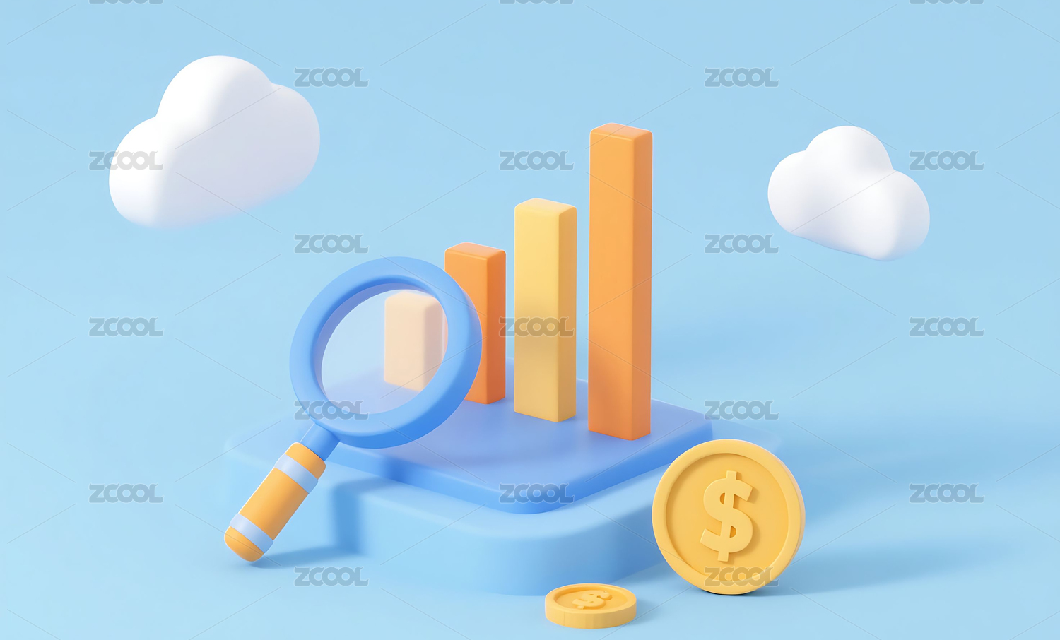 商务金融3D放大镜柱状图金币模型