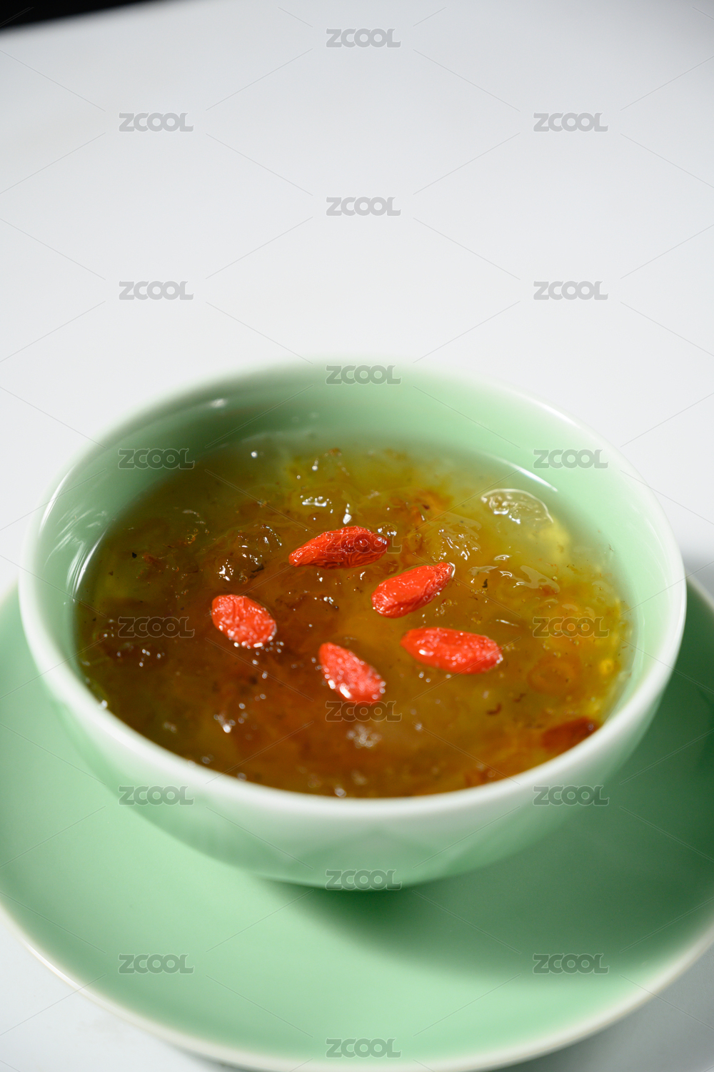 桌面上的盘子里的美味可口的冰糖炖桃胶
