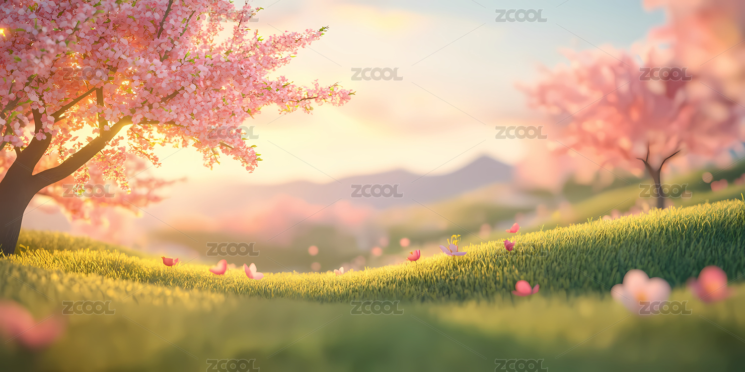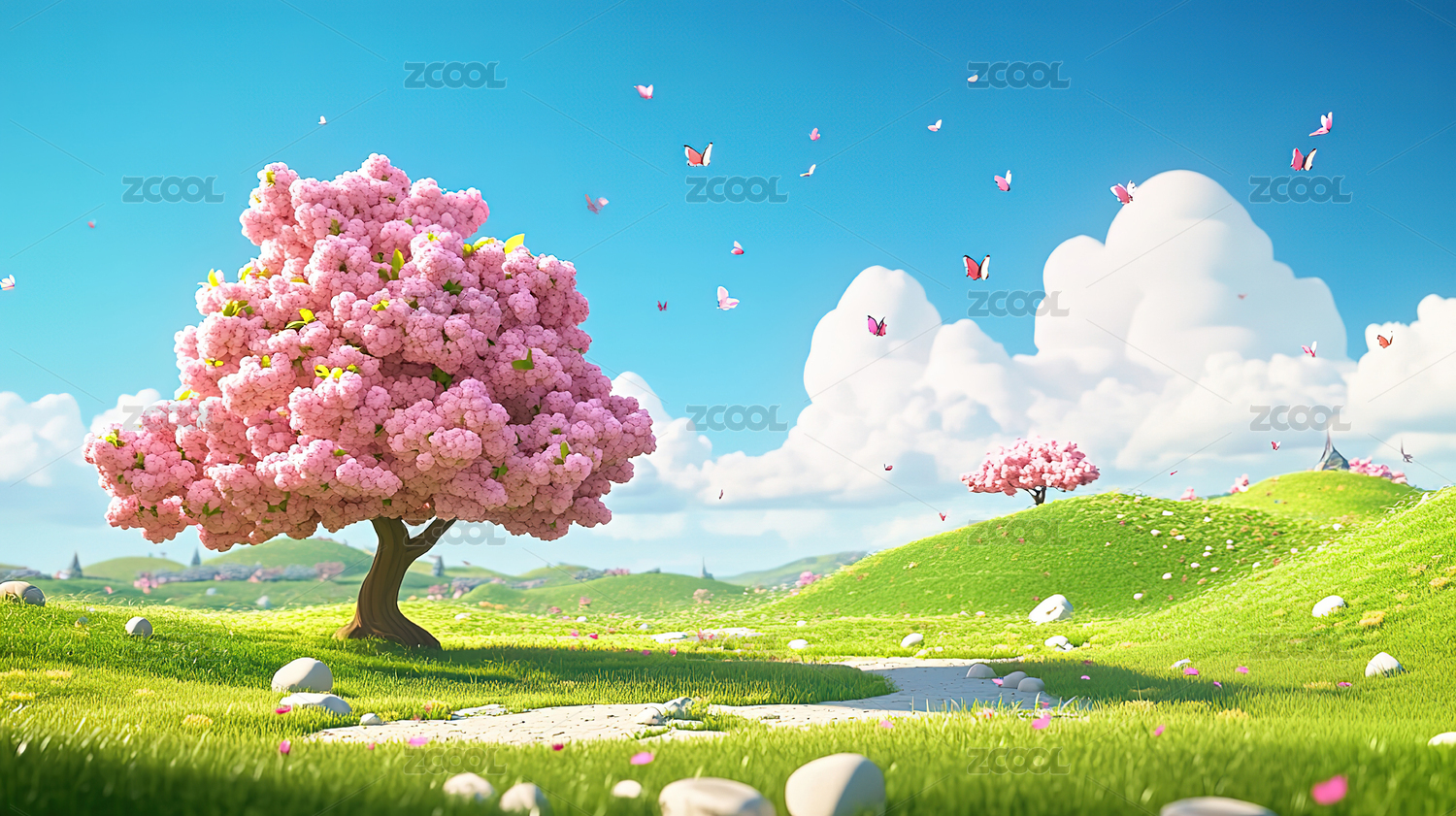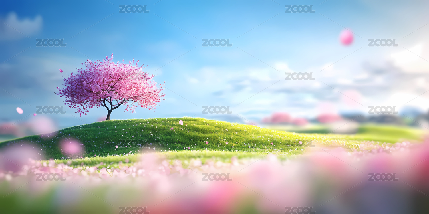 绿色草地上鲜花盛开的一棵树春天风景插画