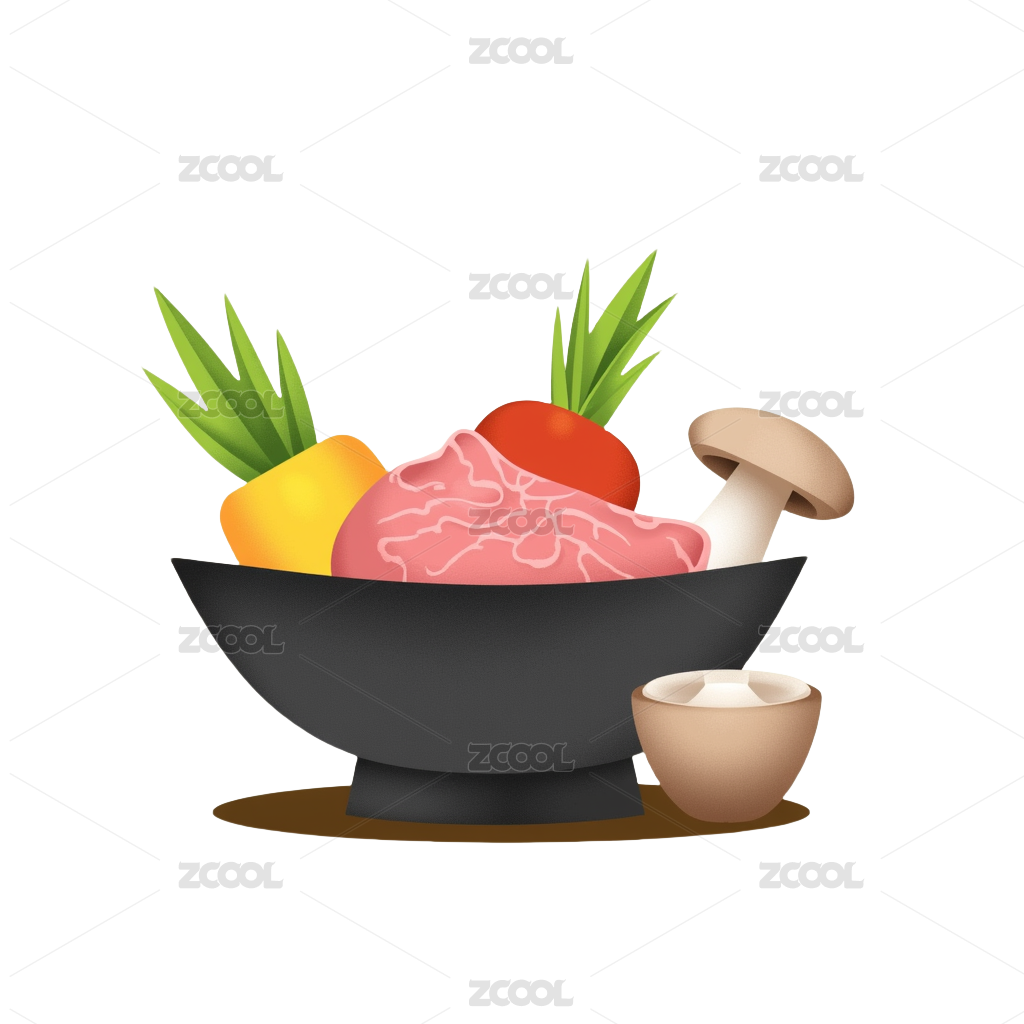 三维渲染白色背景下的火锅和番茄萝卜辣椒