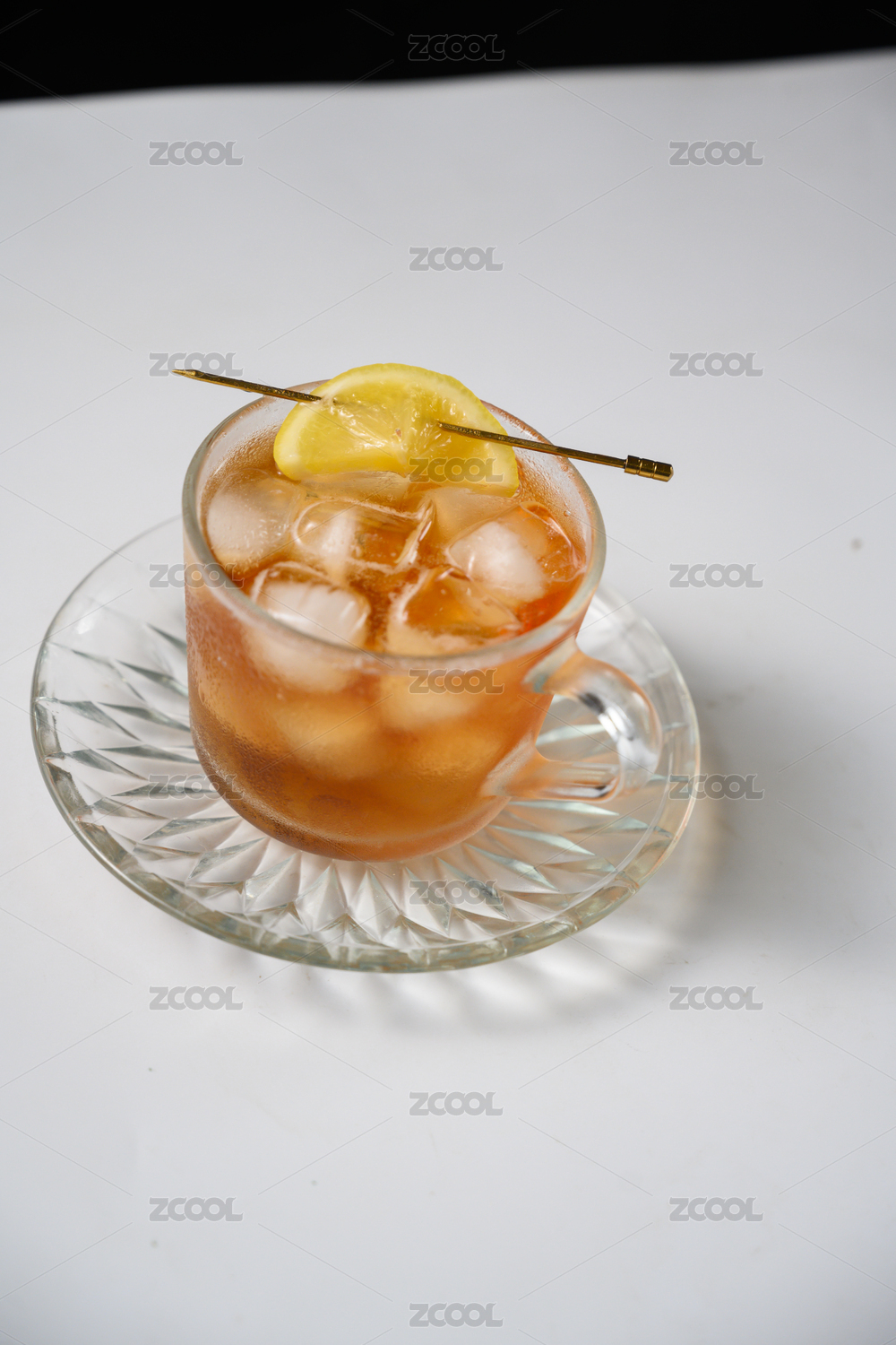 桌面上的杯子里的美味可口的冰蜜桃乌龙茶