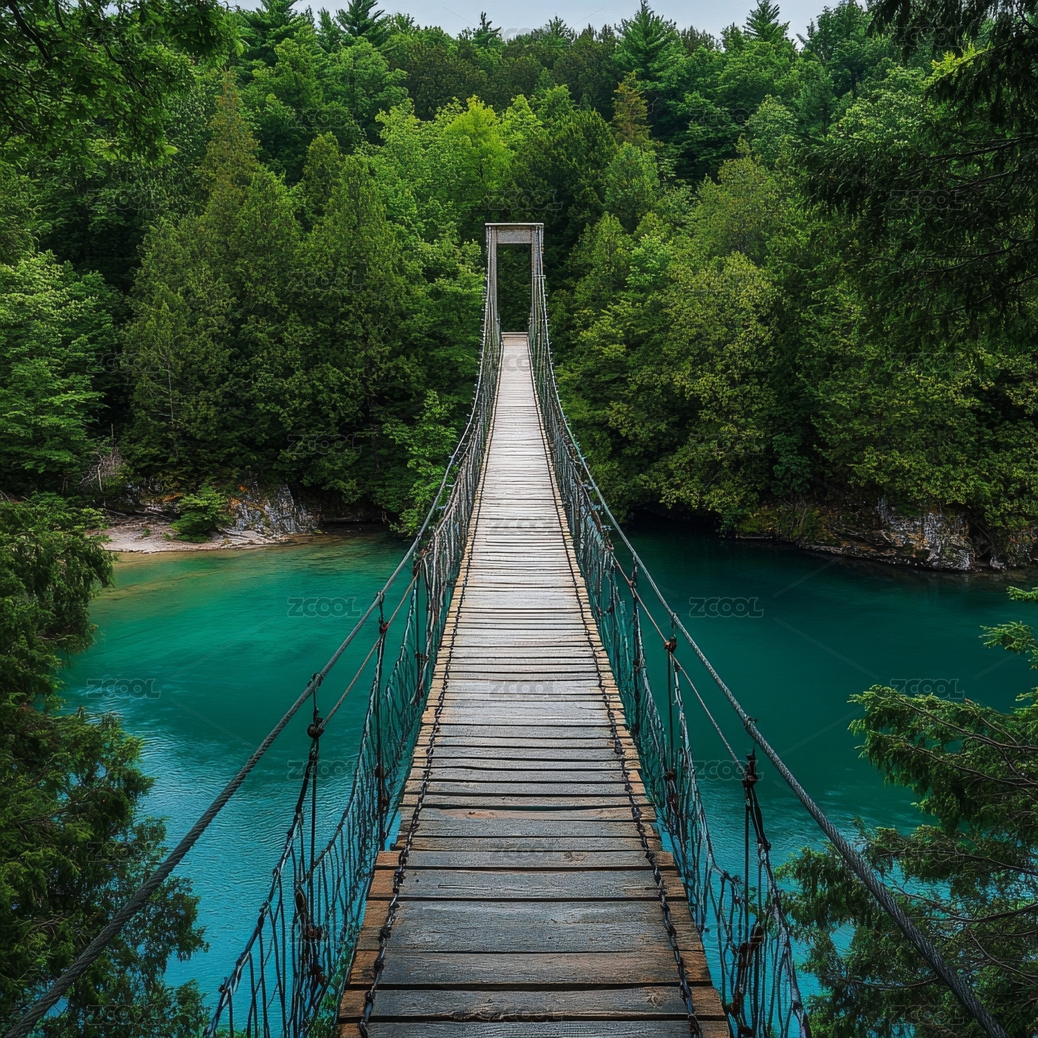 森林中的悬索桥横跨碧绿河流