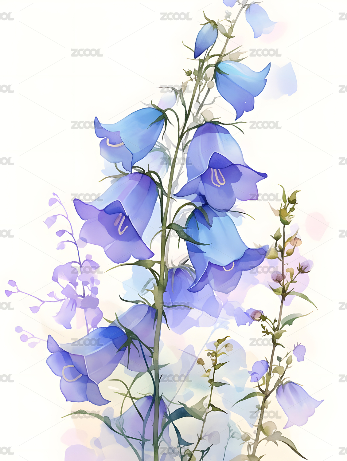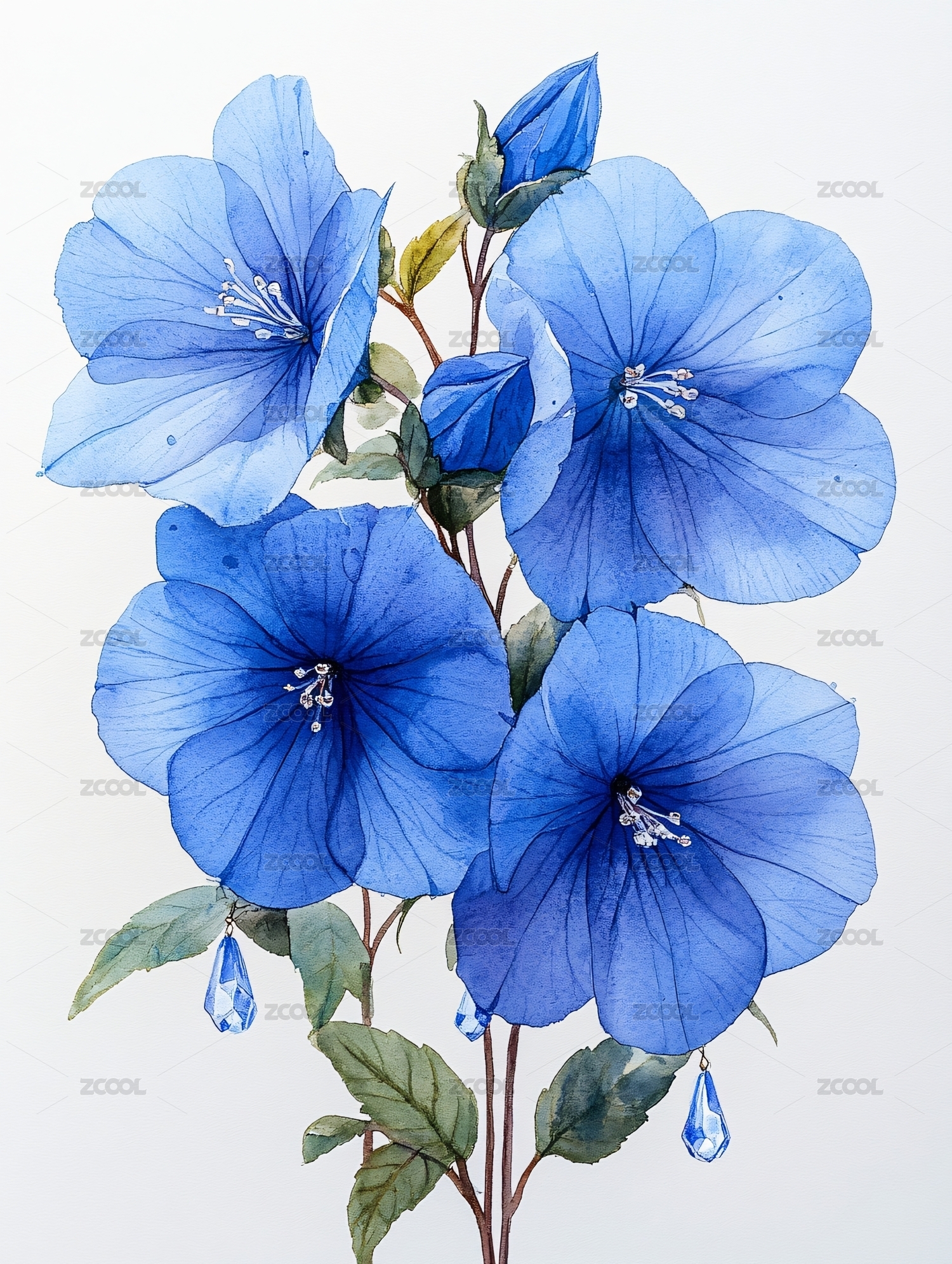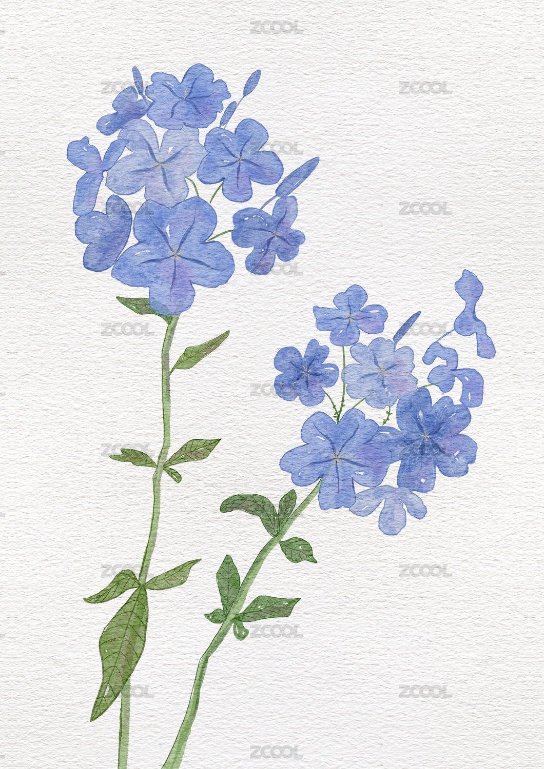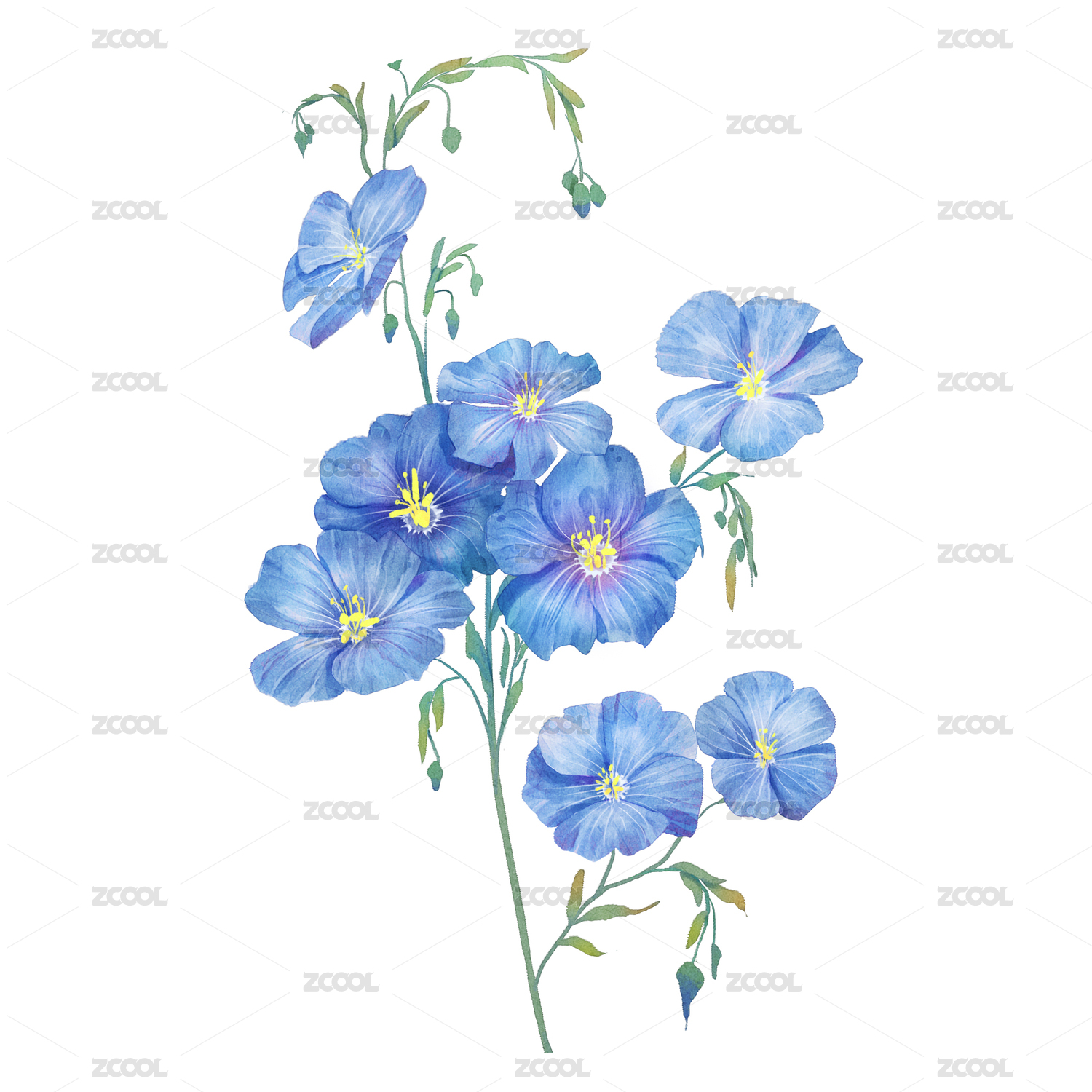 宿根亚麻手绘水彩花卉装饰画蓝色碎花印花