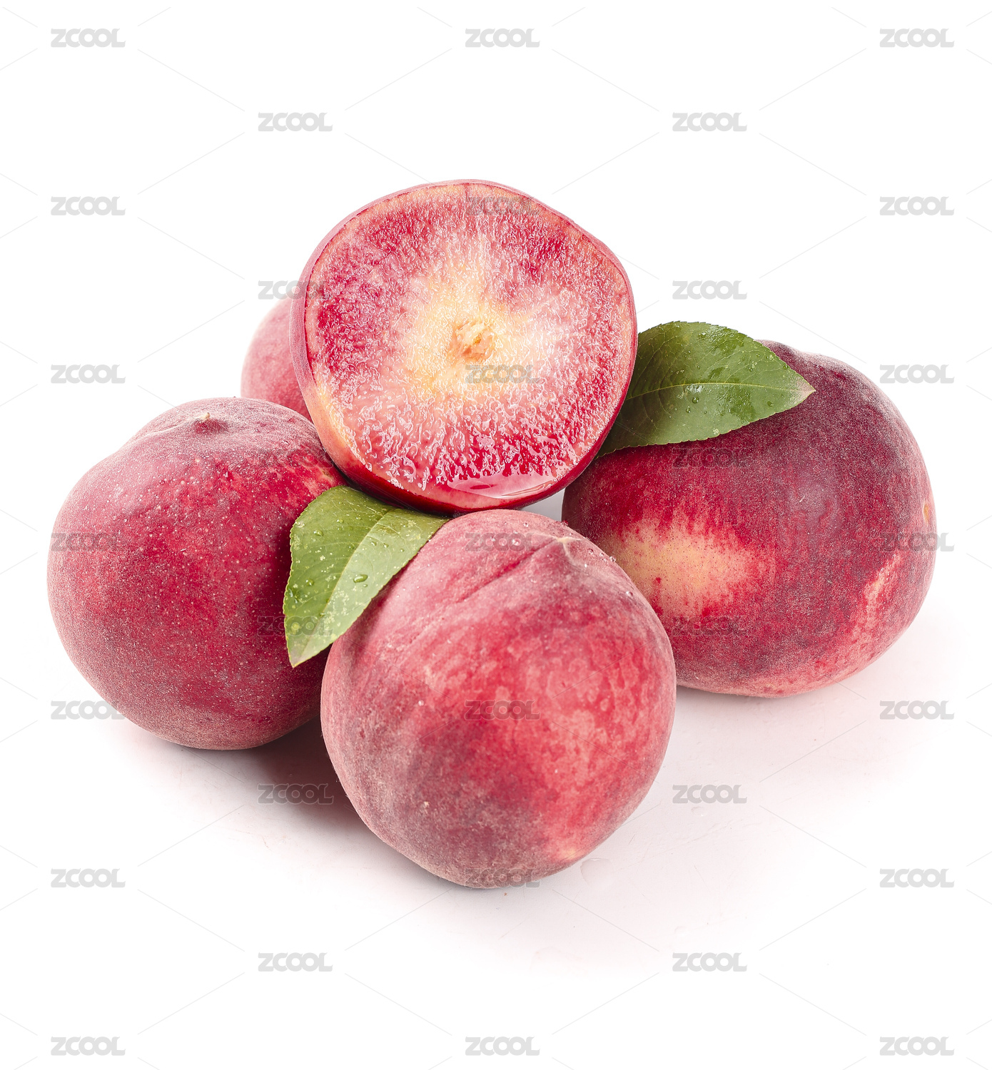 白底上放着两个半边水蜜桃和血桃