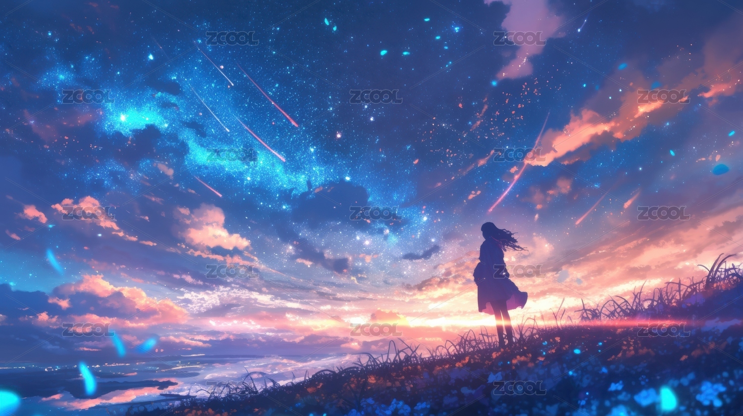 二次元,少年,山丘,山峰,黄昏,背影,天空,山坡