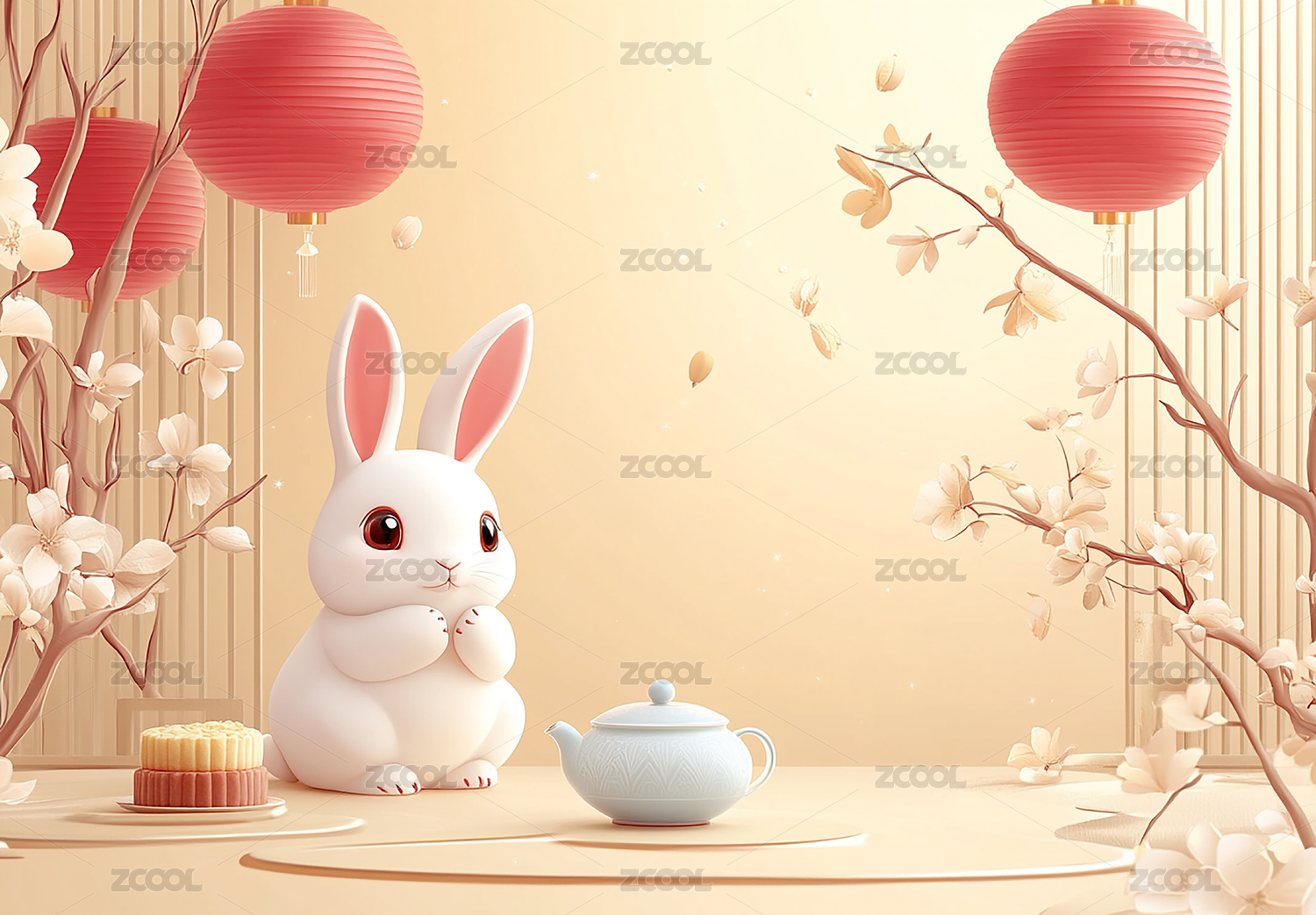 可爱白兔和月饼花窗祥云中秋节3D插画