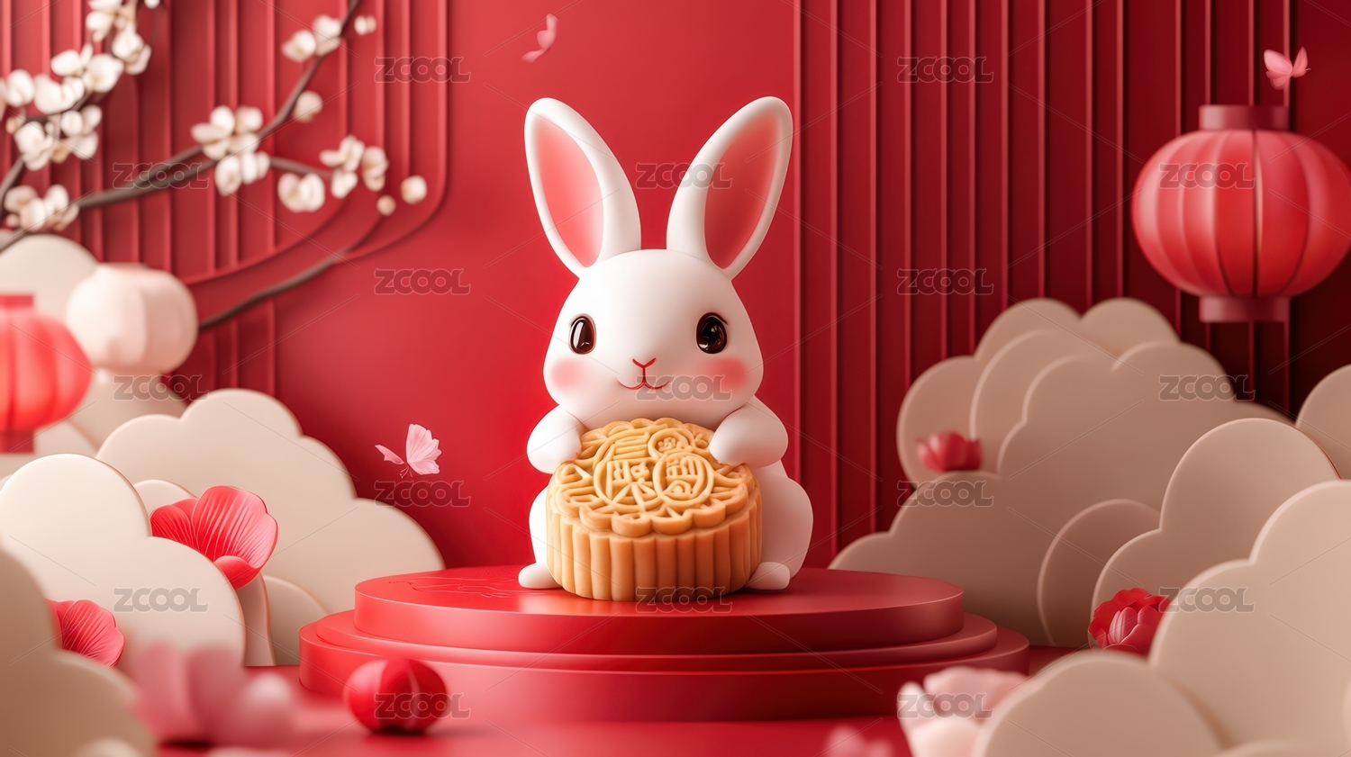 可爱兔子手捧月饼的3D插画