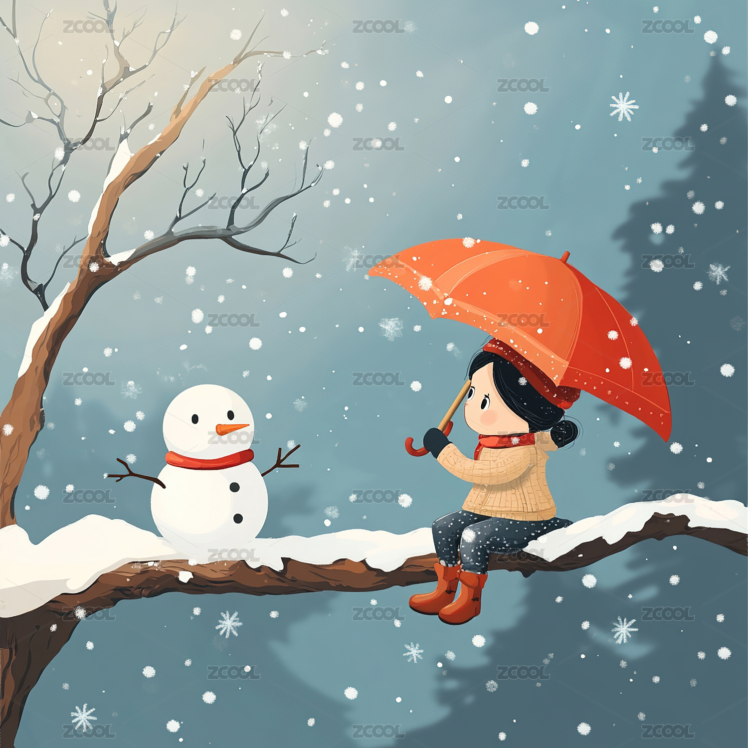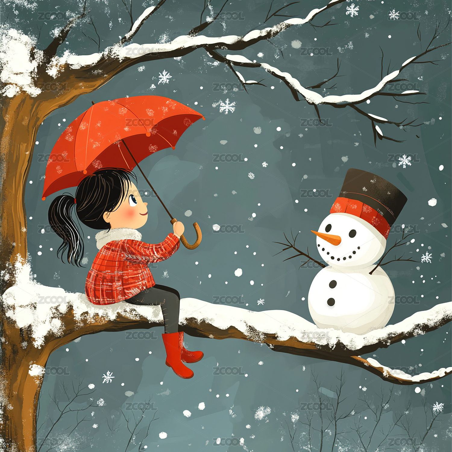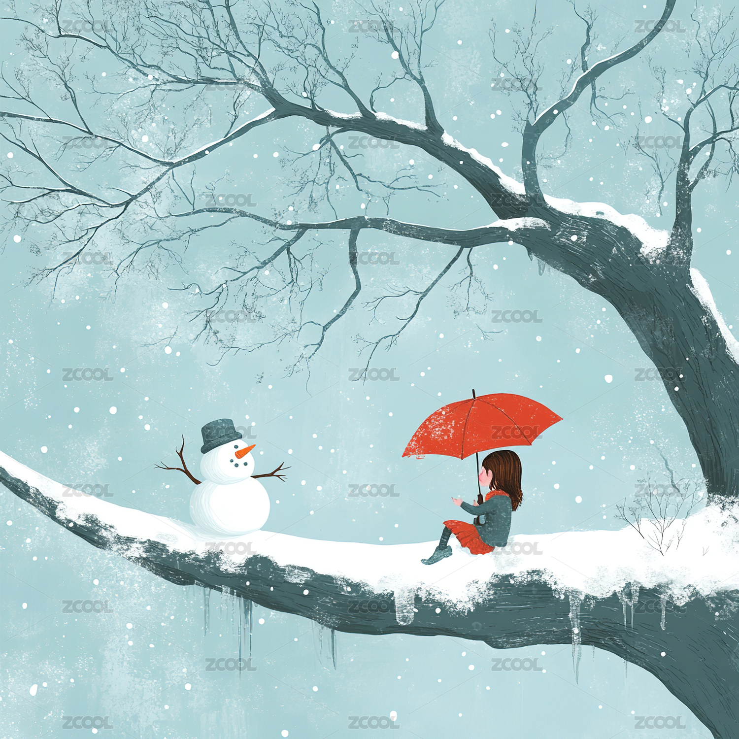 女孩坐在老树上旁边还有一个雪人