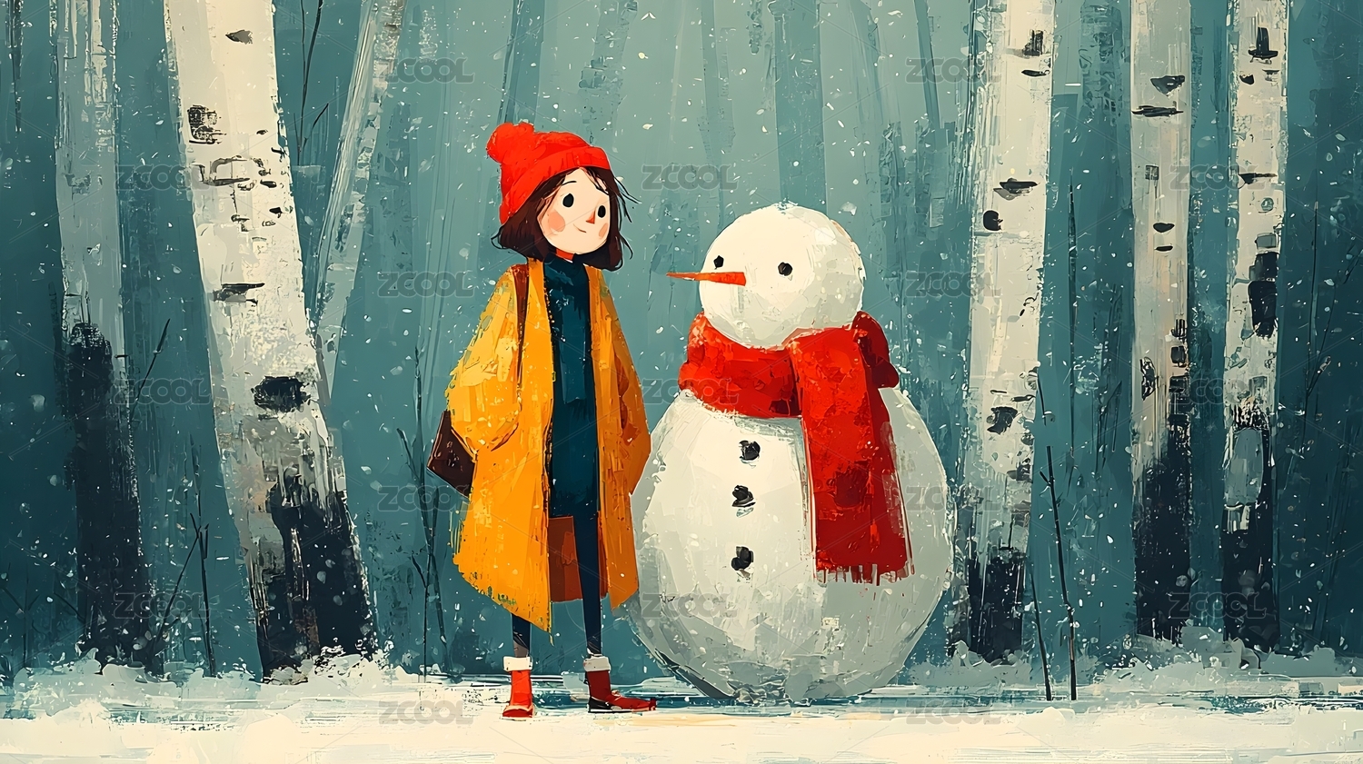冬日雪人与女孩的森林
