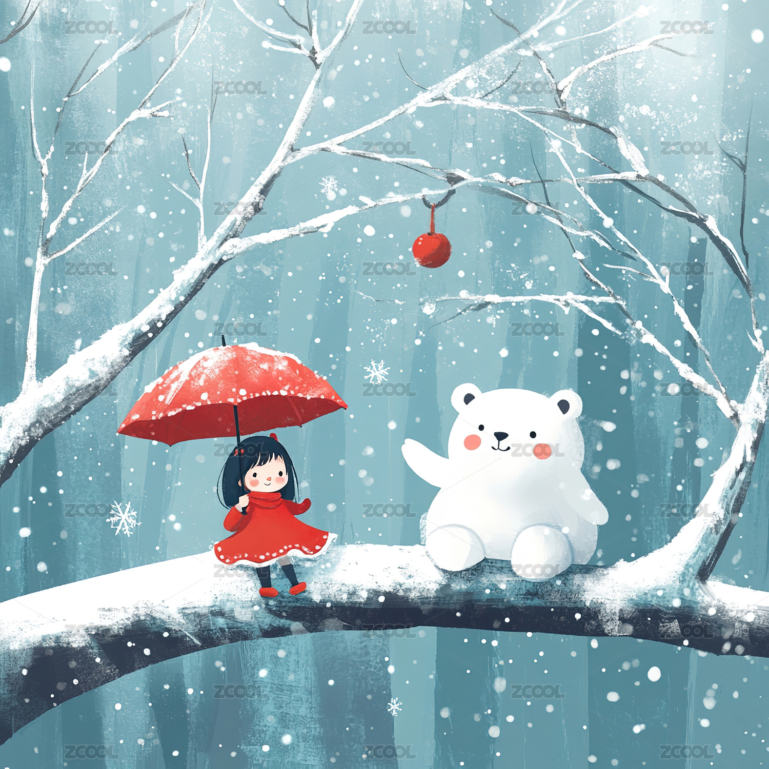 冬季,女孩,北极熊,雪,树枝,红伞,圣诞球,雪花,童话,可爱