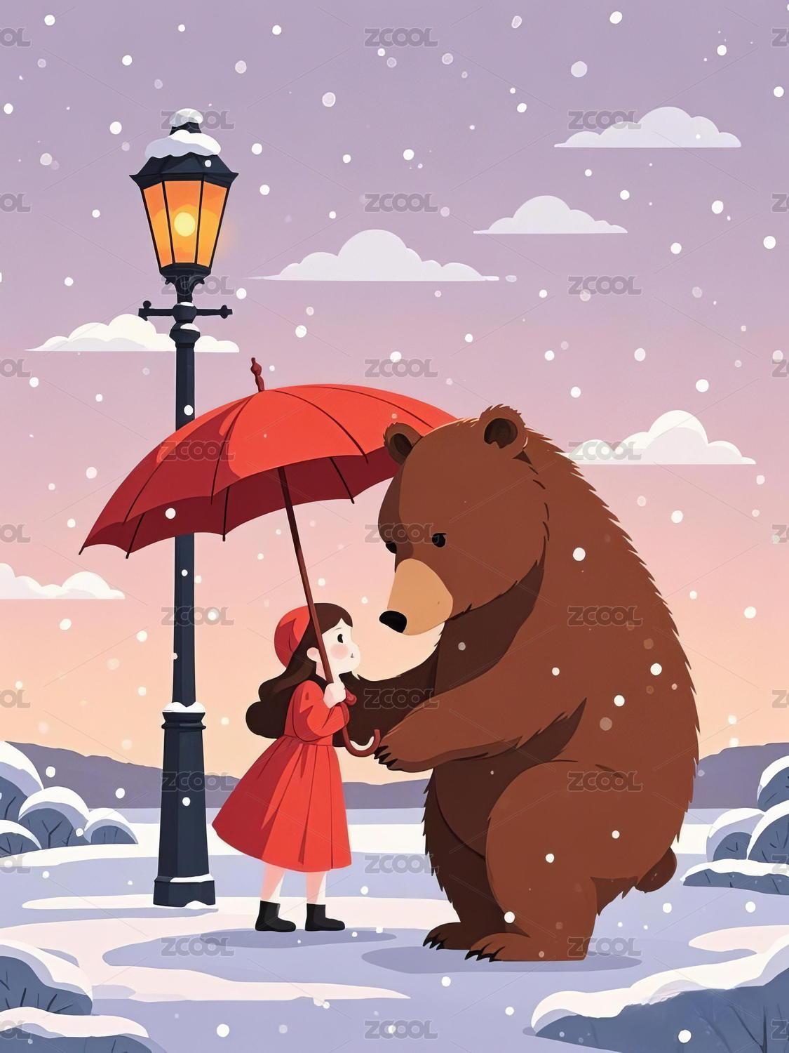 冬季里拿着雨伞的大白熊和小女孩