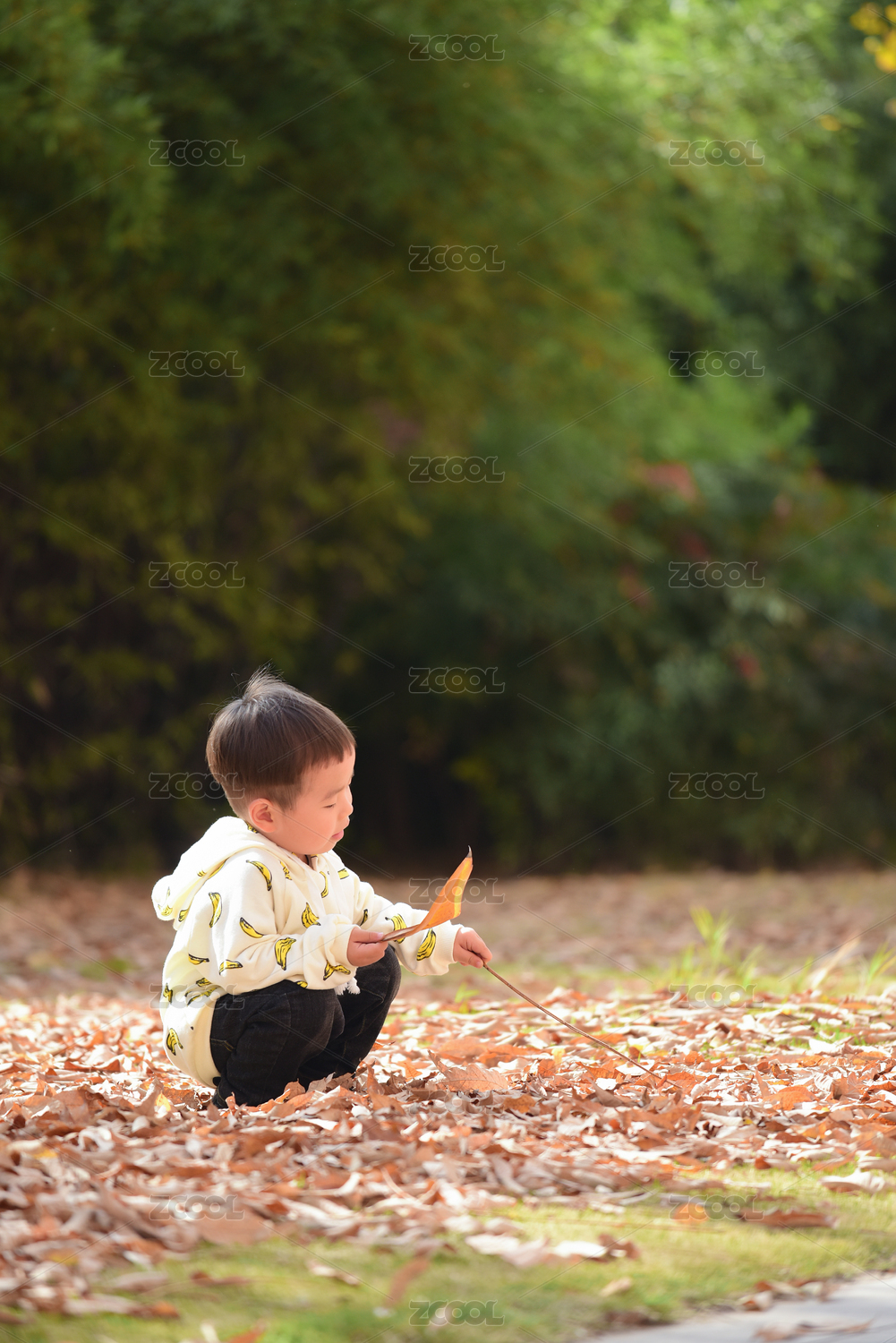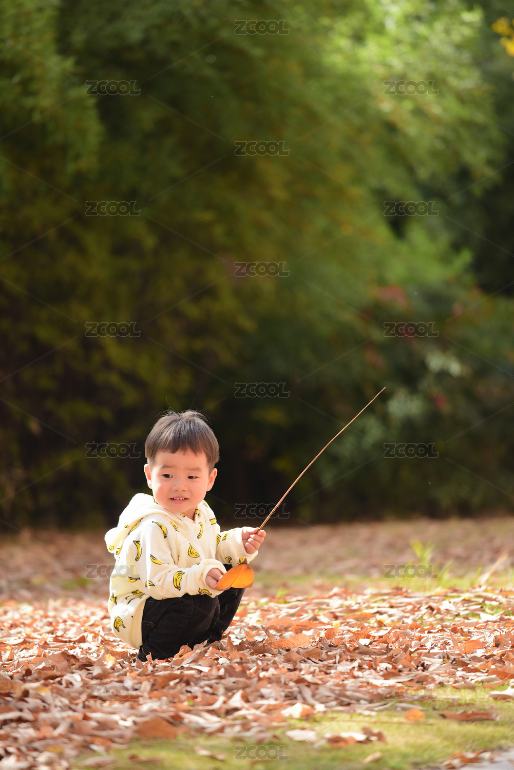 蹲在落满树叶的草地上拿着树枝玩耍的小男孩