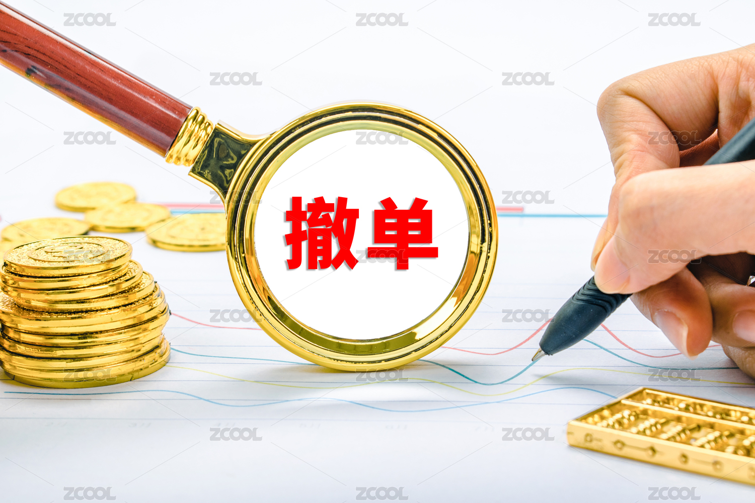 数据图表上的放大镜印着文字现金