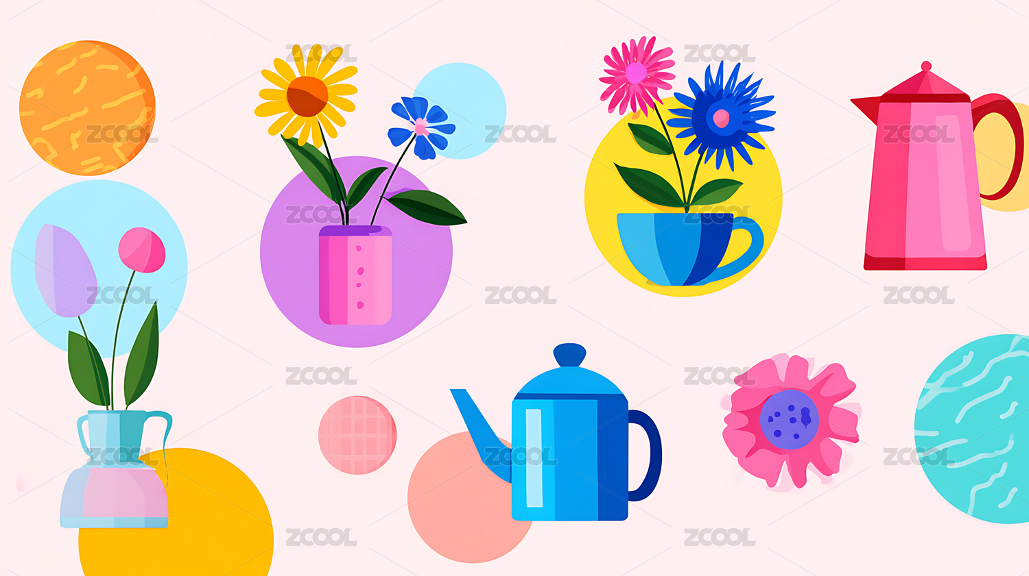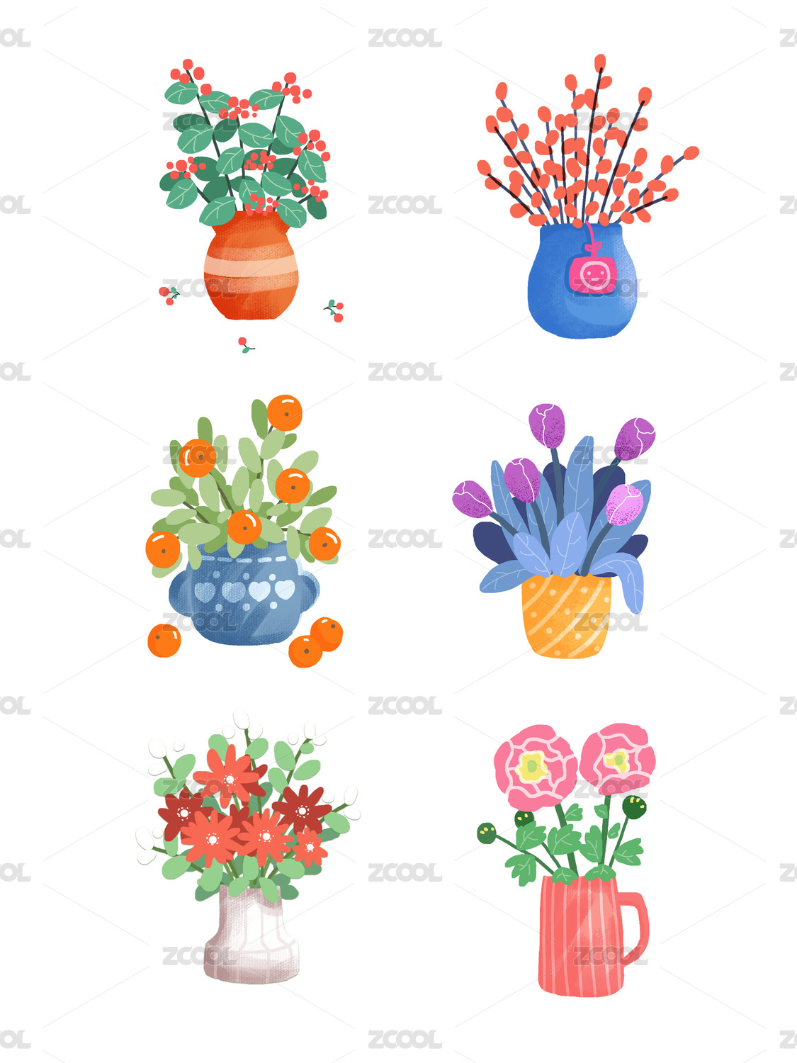 手绘风格花瓶花卉插画组合