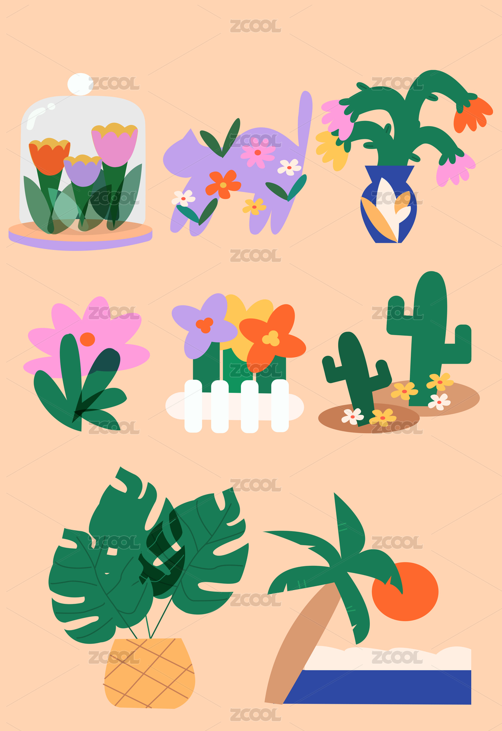 植物花朵风景元素 ,扁平风格