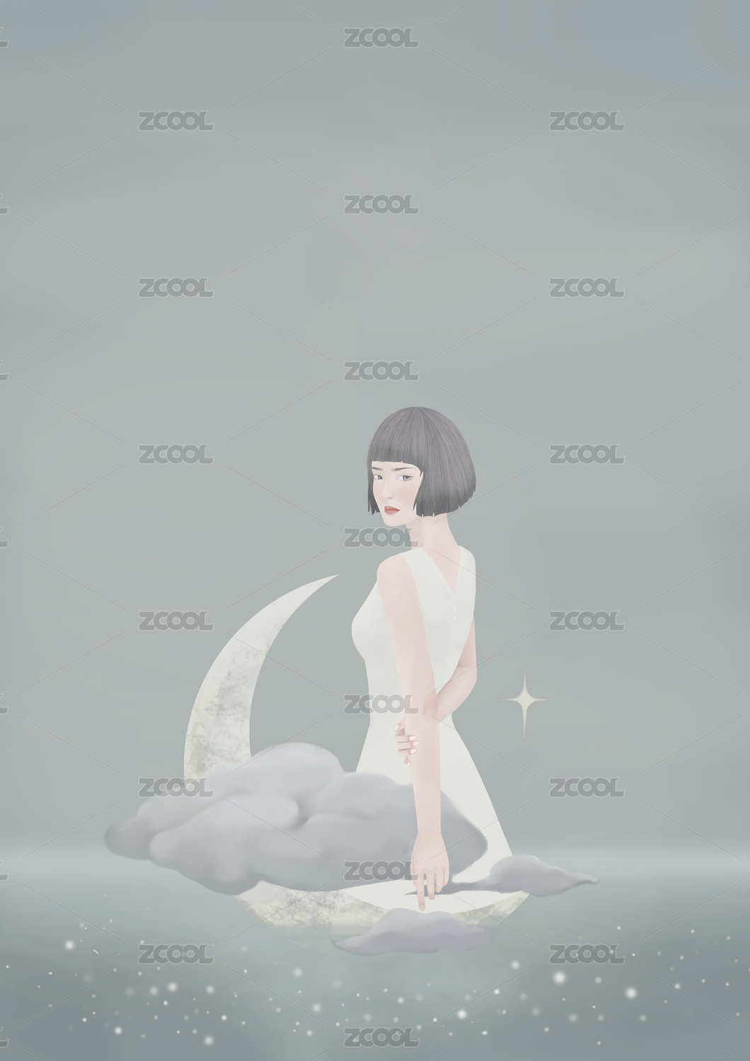 插画,夏天,绿色,户外,天空,少女,小清新,月亮,星座,云朵