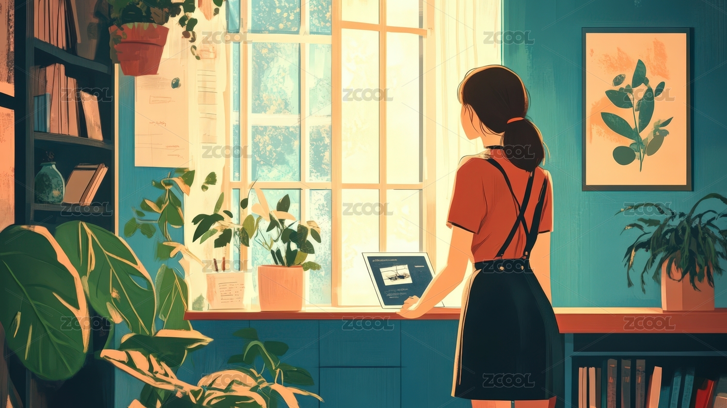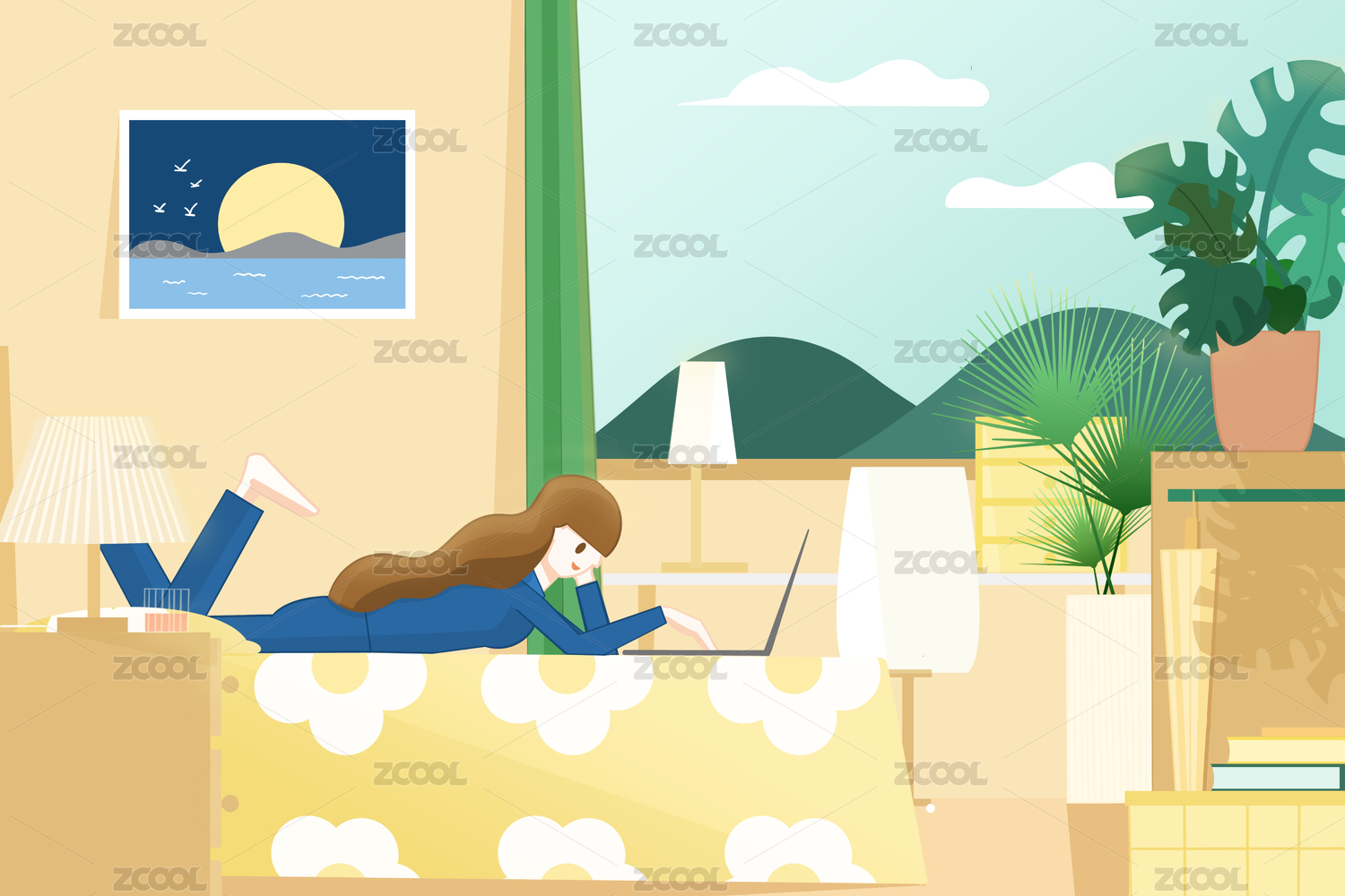 复工,插画,金融,商务,扁平风,少女,房间,手机端,上班,办公