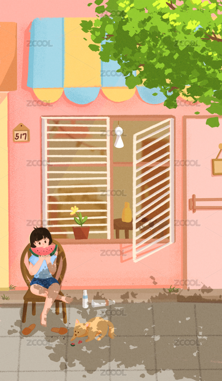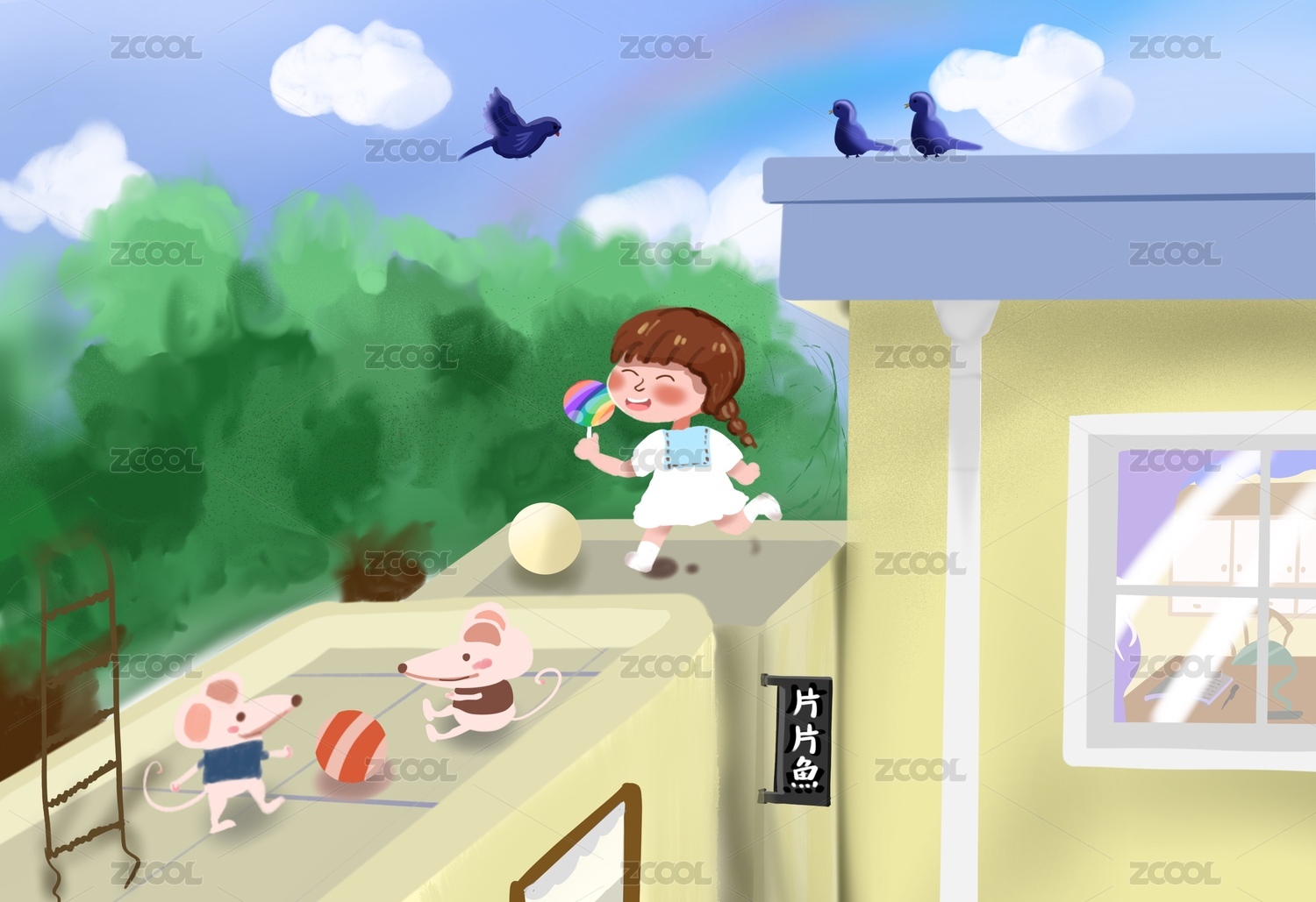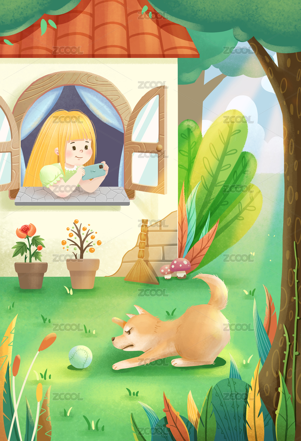 小女孩正在帮小白猫赶走野猫 板绘厚涂
