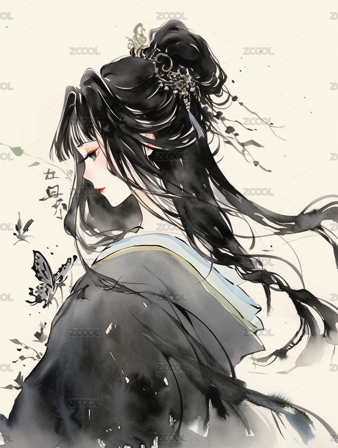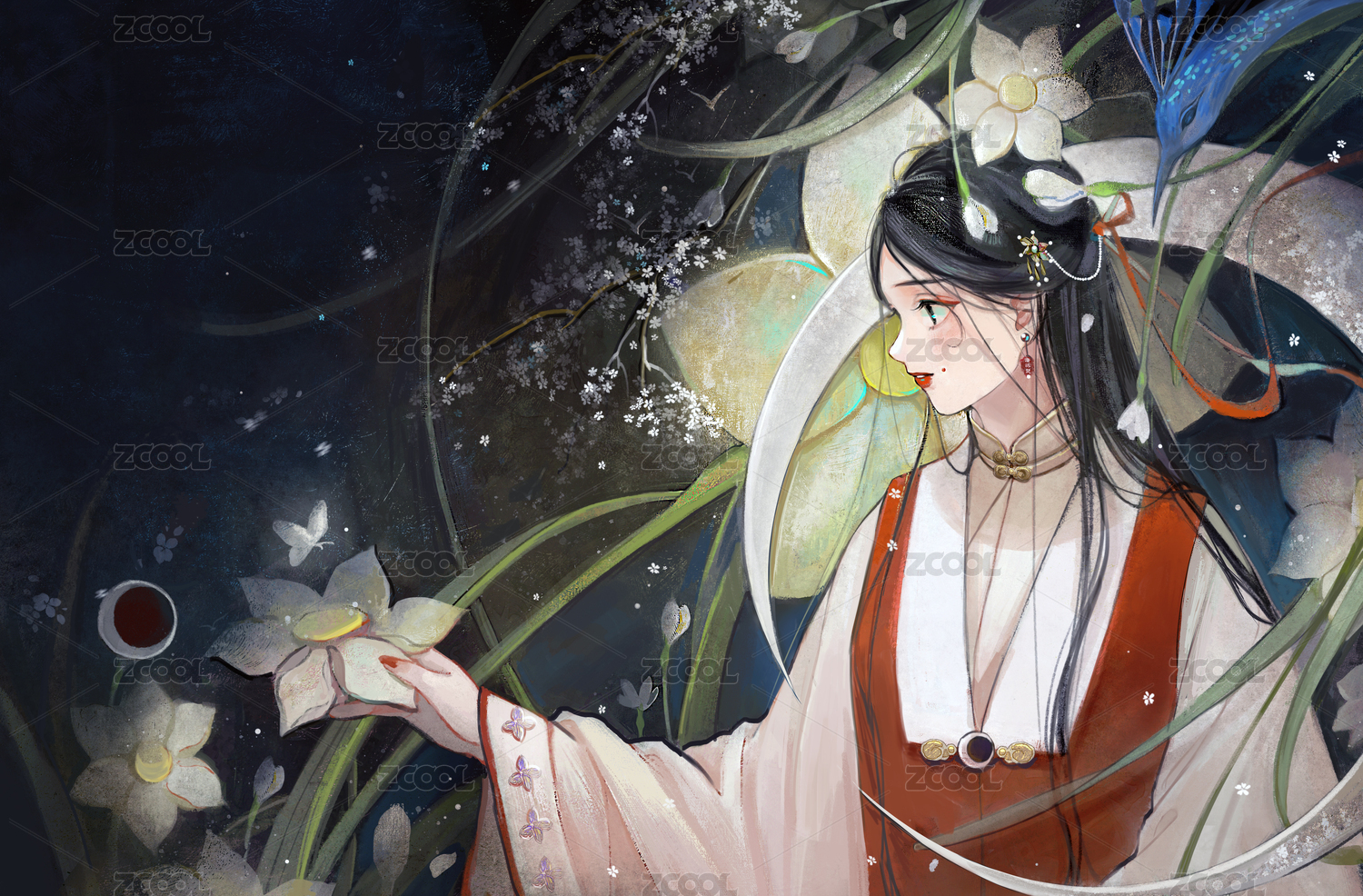 中国风古风汉服细线人物花卉插画-洛神喝茶