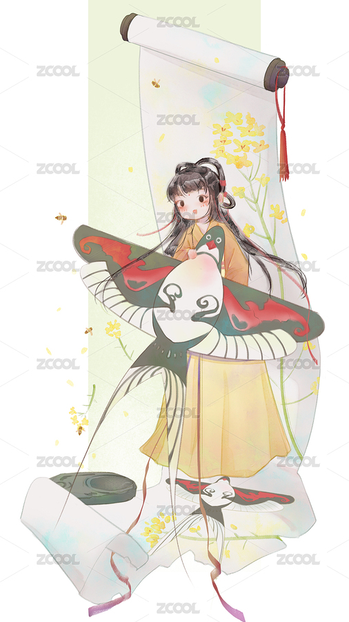 油菜花,古风,水墨,水彩,纸鸢,小人,插画,儿童,春天