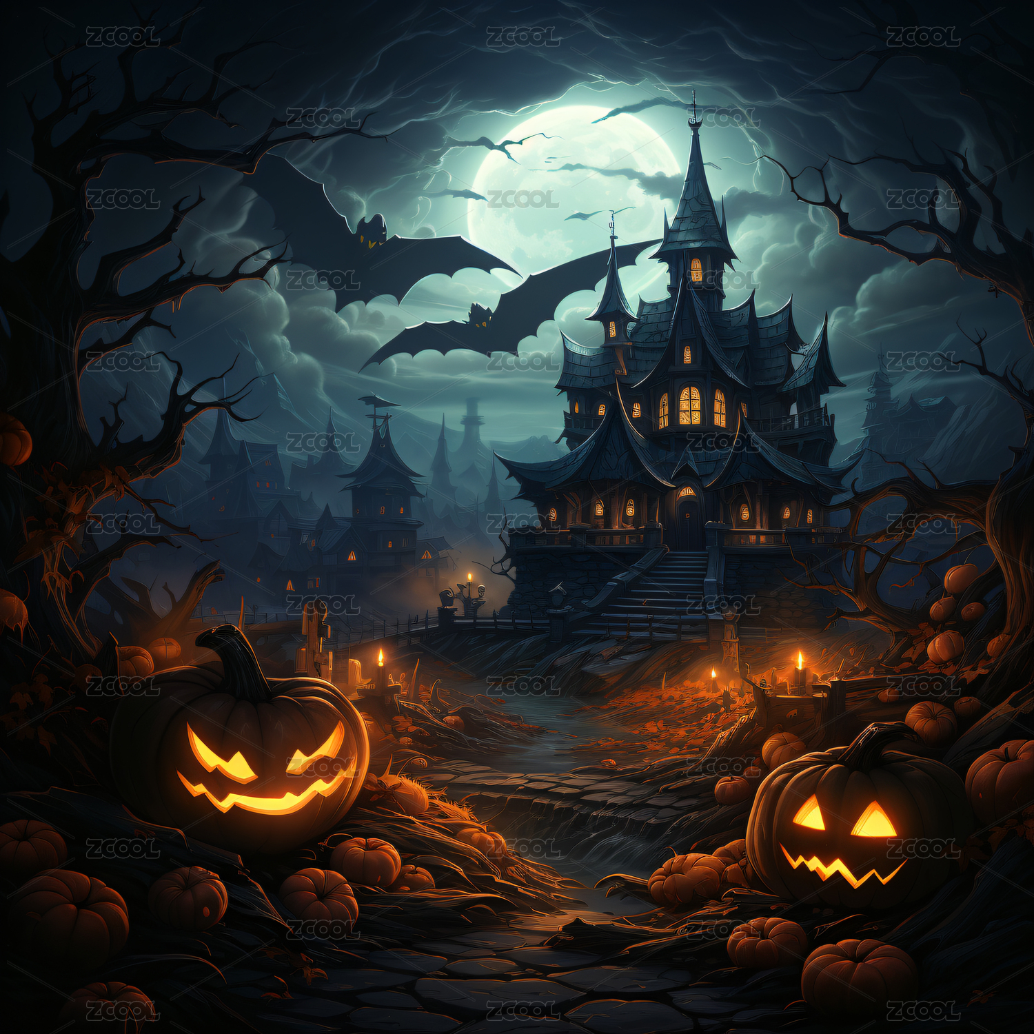 万圣节主题邪恶南瓜城堡插图壁纸背景