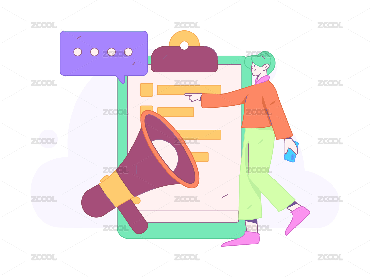 邀请好友参与问卷调查女, 矢量扁平人物场景创意概念插画