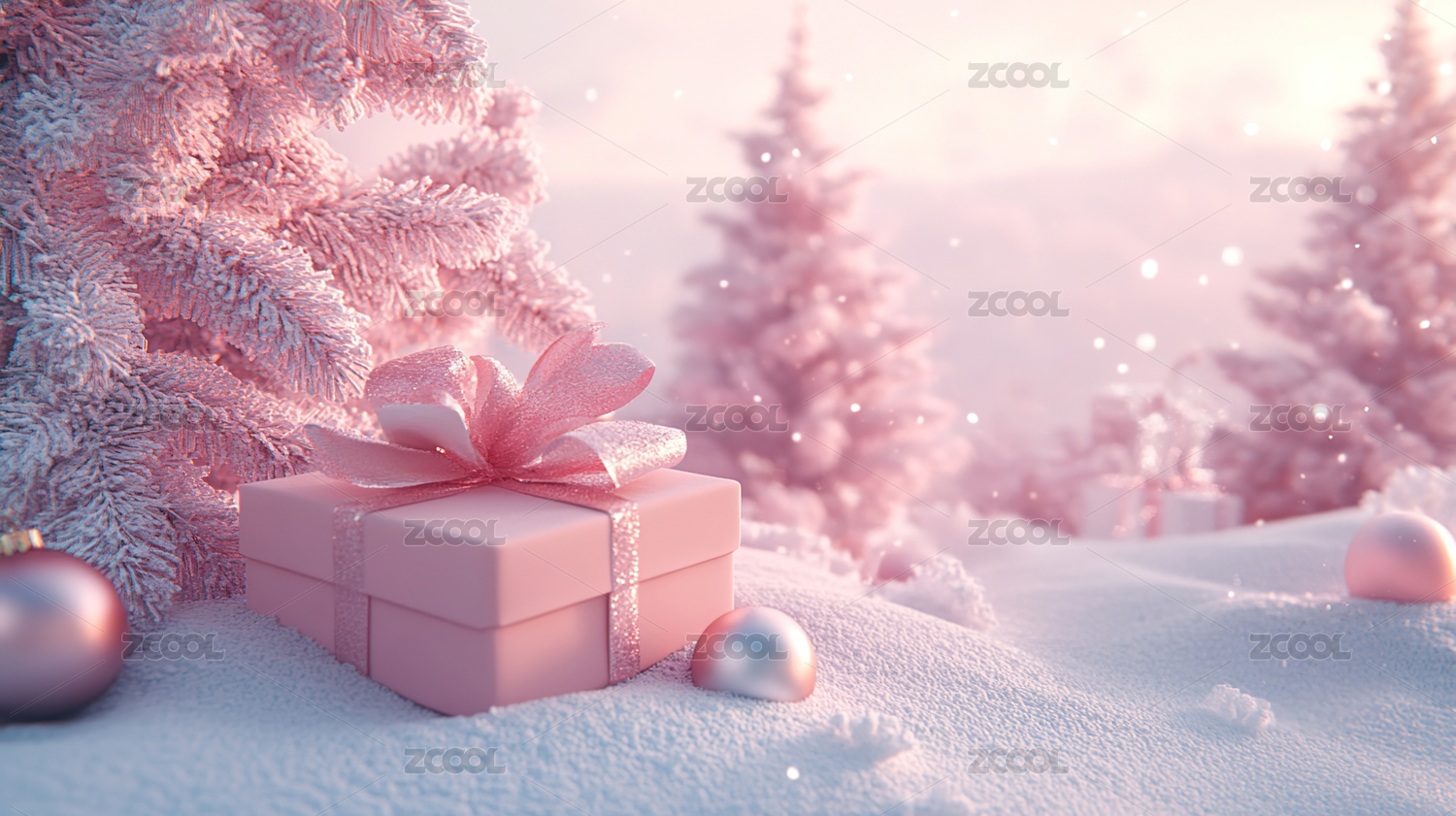 粉金色圣诞礼物与装饰球的梦幻场景