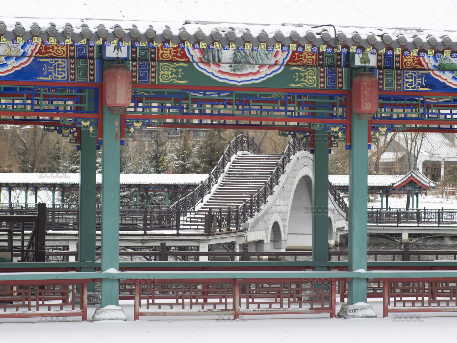 中国山西省长治市湿地冬天被白雪覆盖的桥