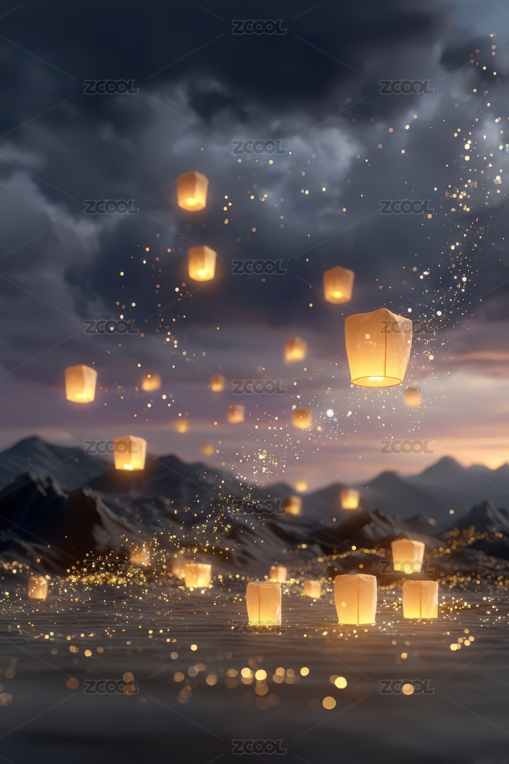 山林孔明灯夜景