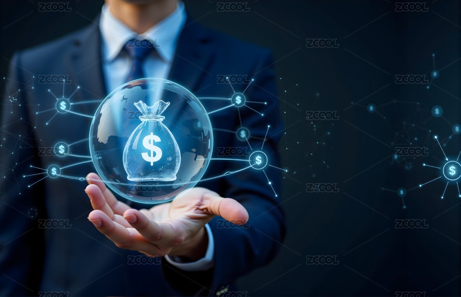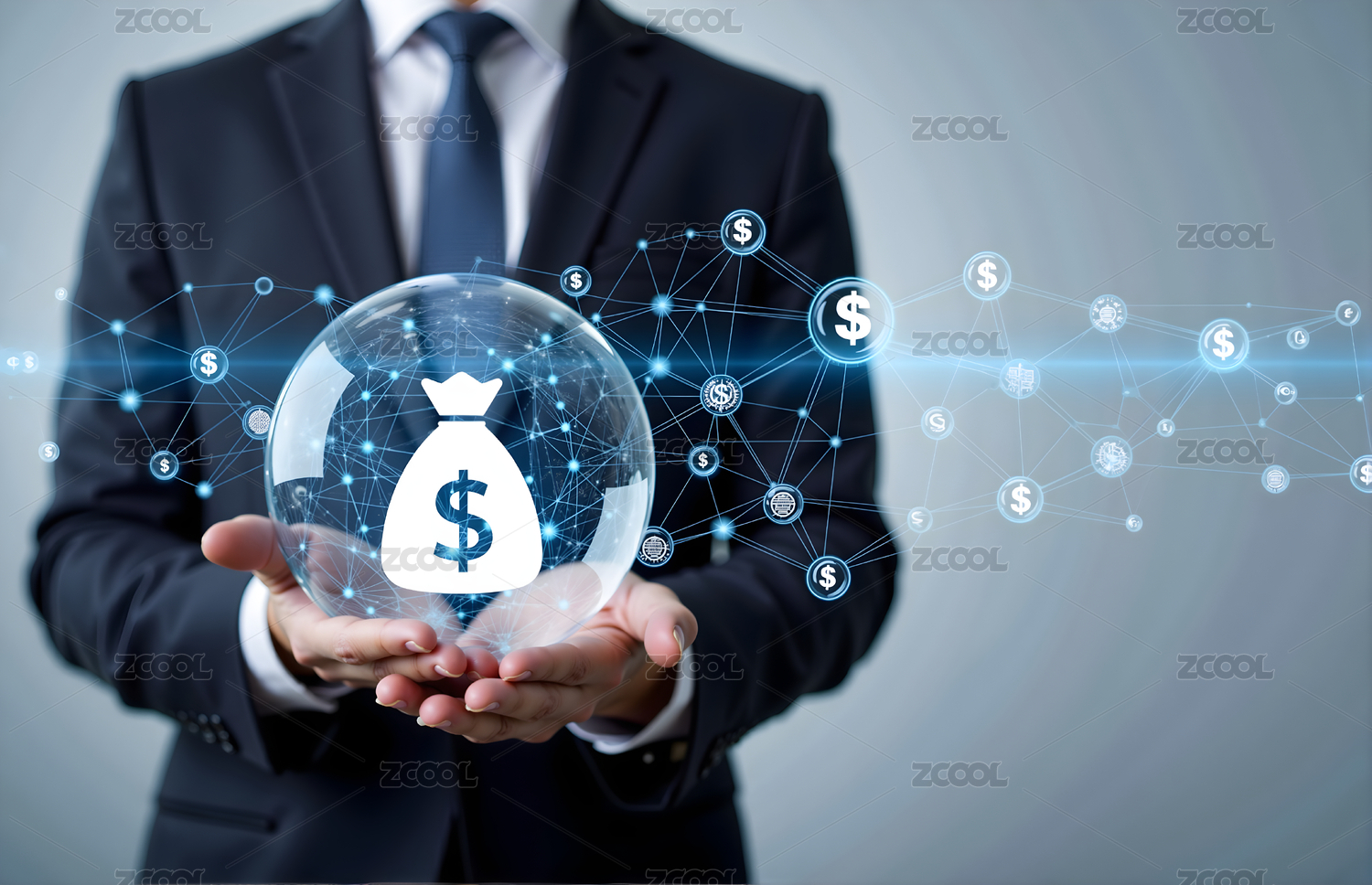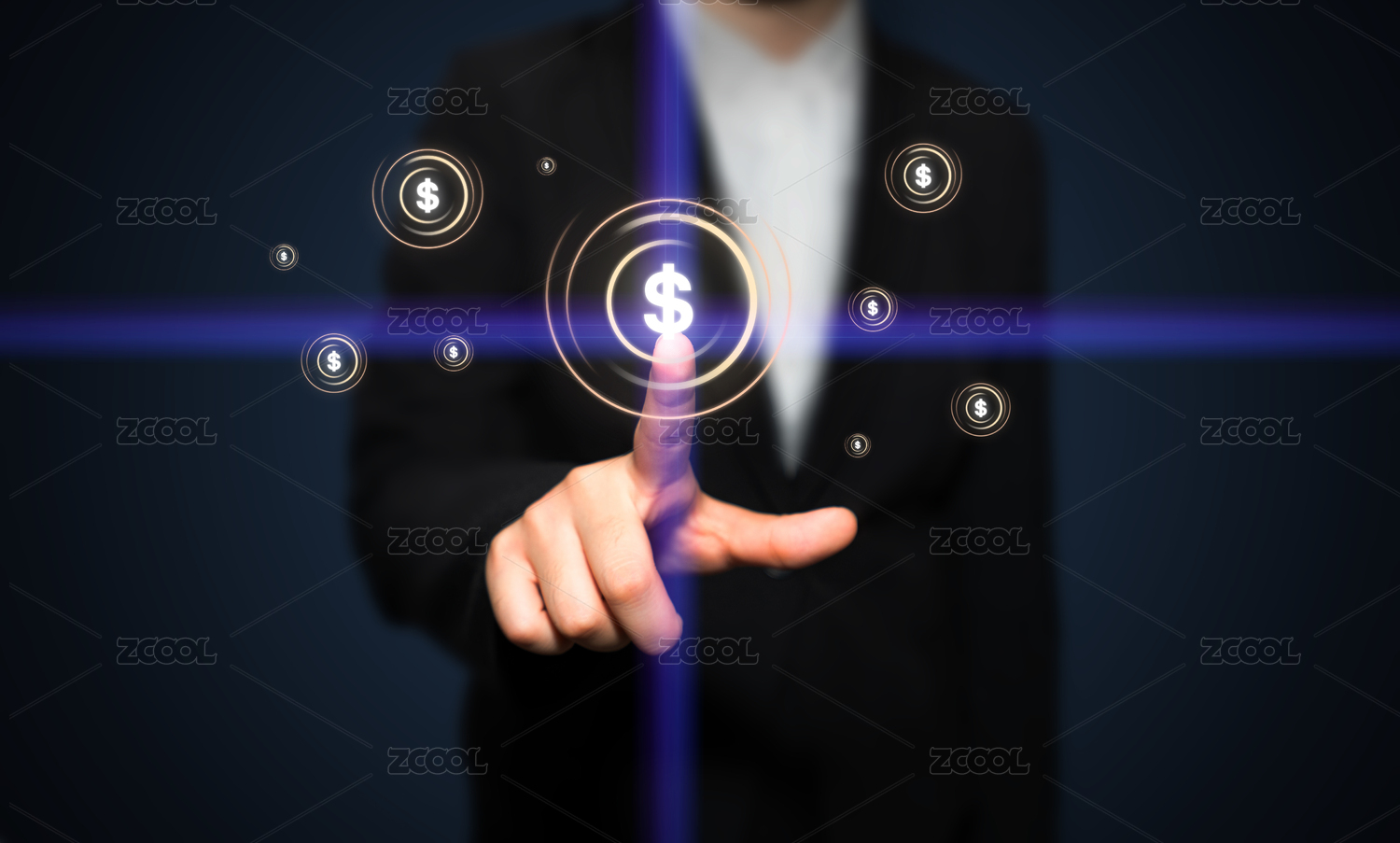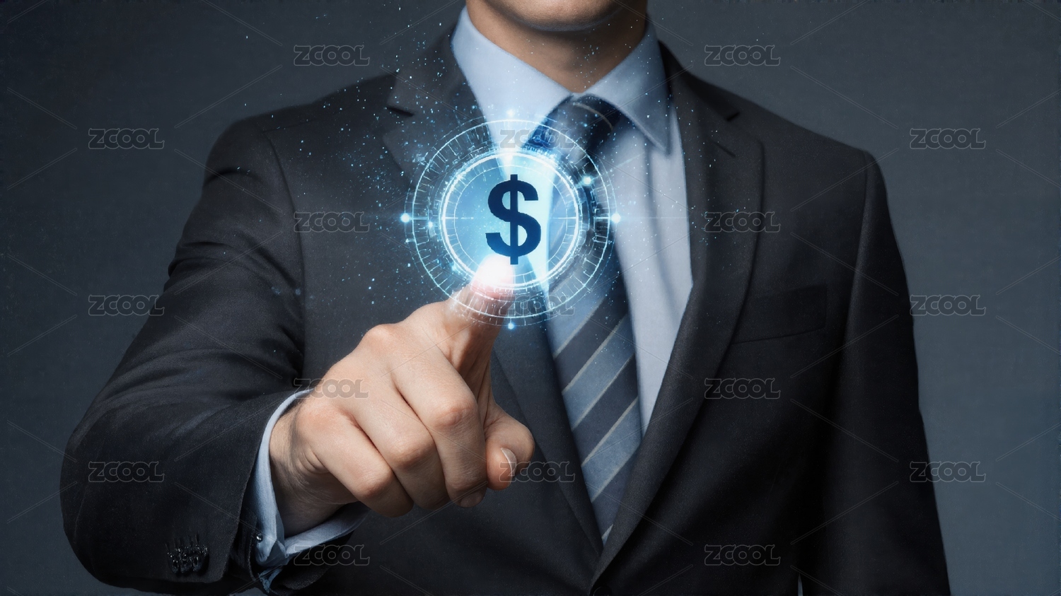 一个商务人士手指着金钱美元符号虚拟数字货币区块链投资理财概念
