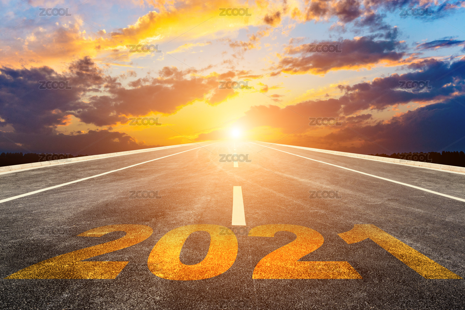 日出时2021年数字写在笔直向前的道路上