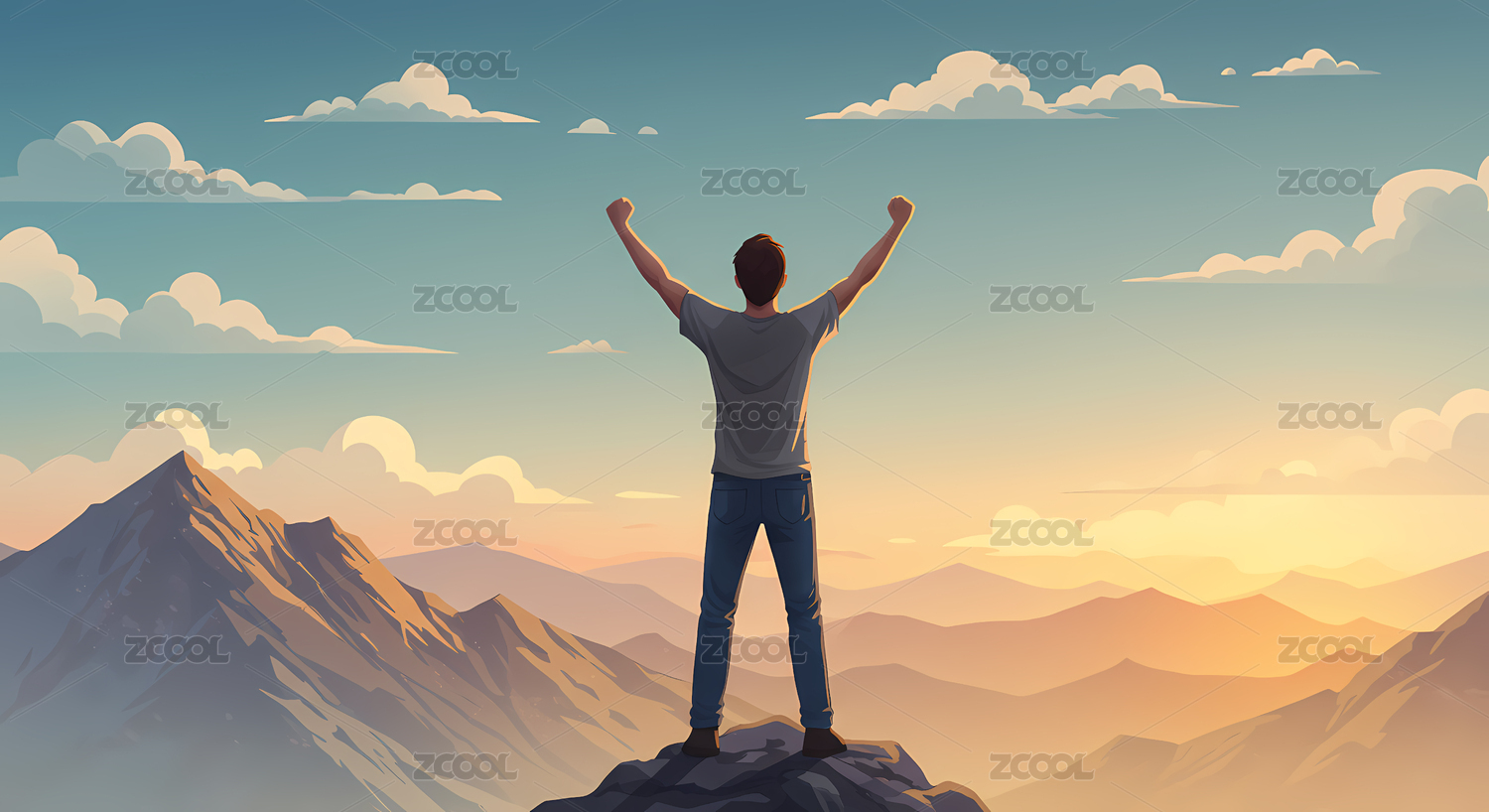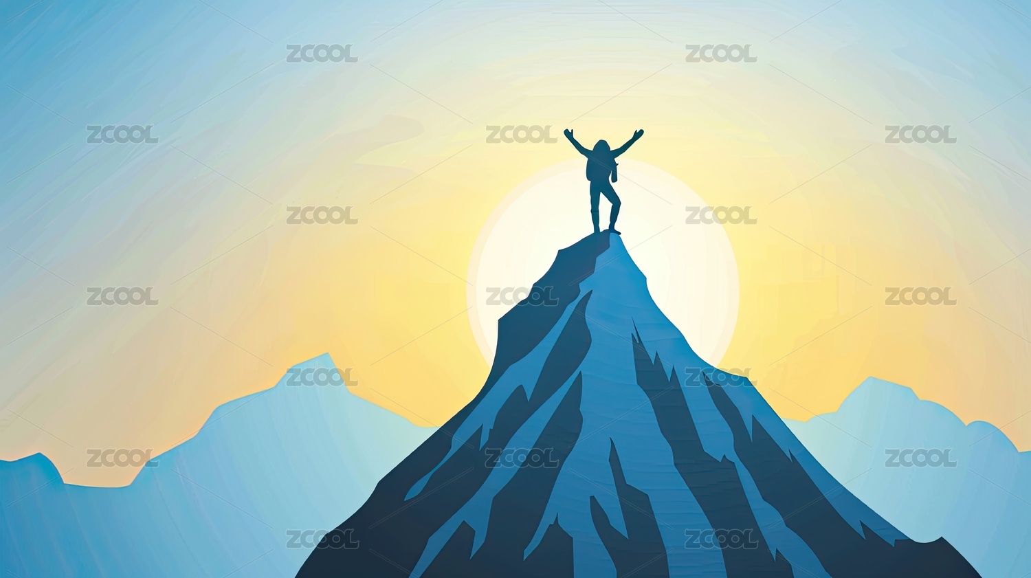 励志,剪影,人物,欢呼,庆祝,山顶,旗子,成功,胜利,努力