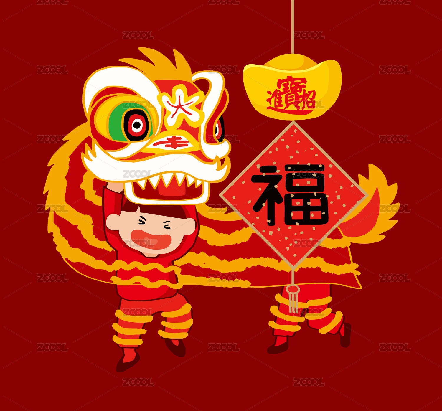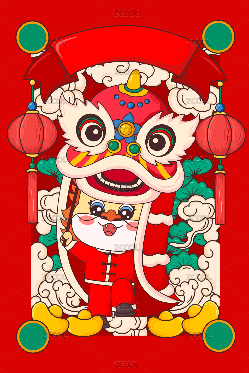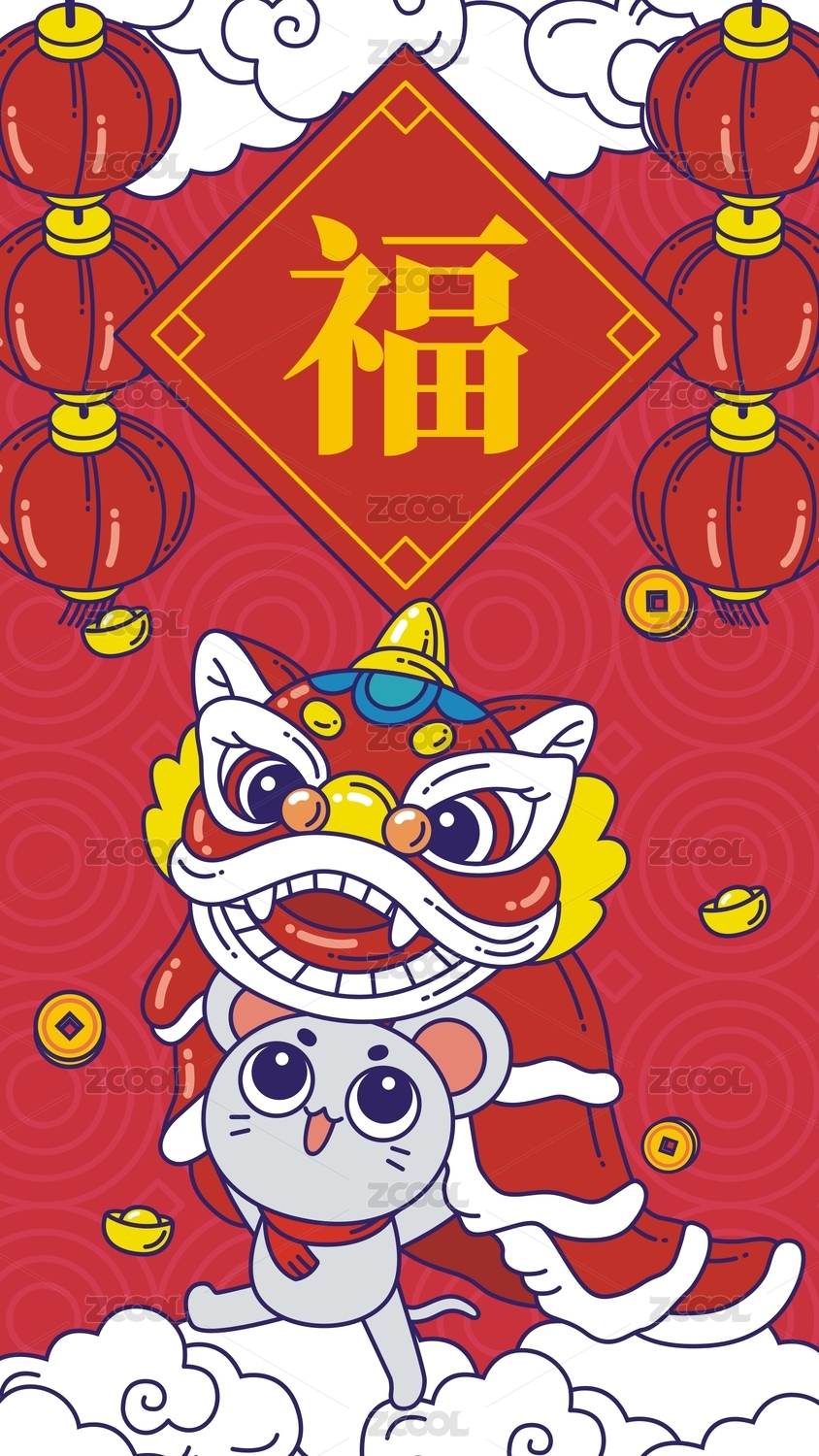 原创矢量中国风国潮插画喜庆鼠年老鼠舞狮