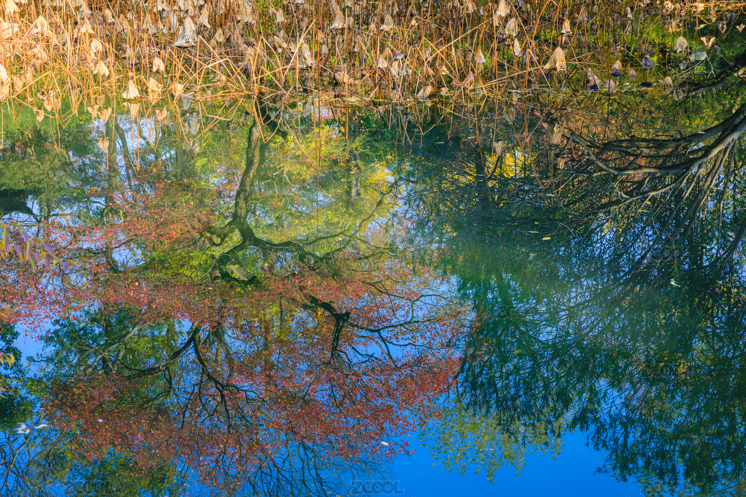 水杉倒映在湖面上