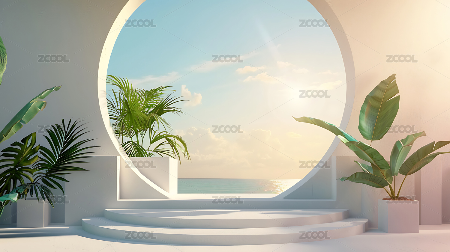白色清爽简约棕榈展台电商三维空间