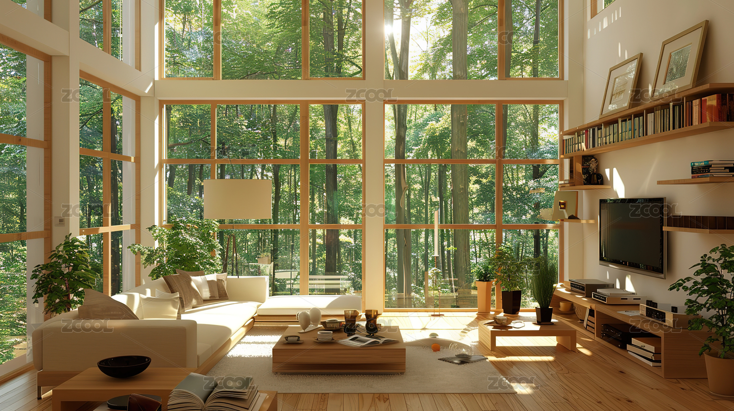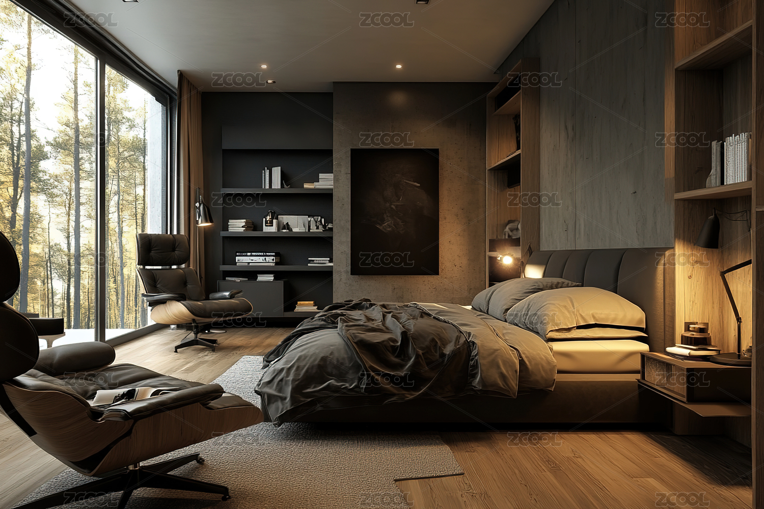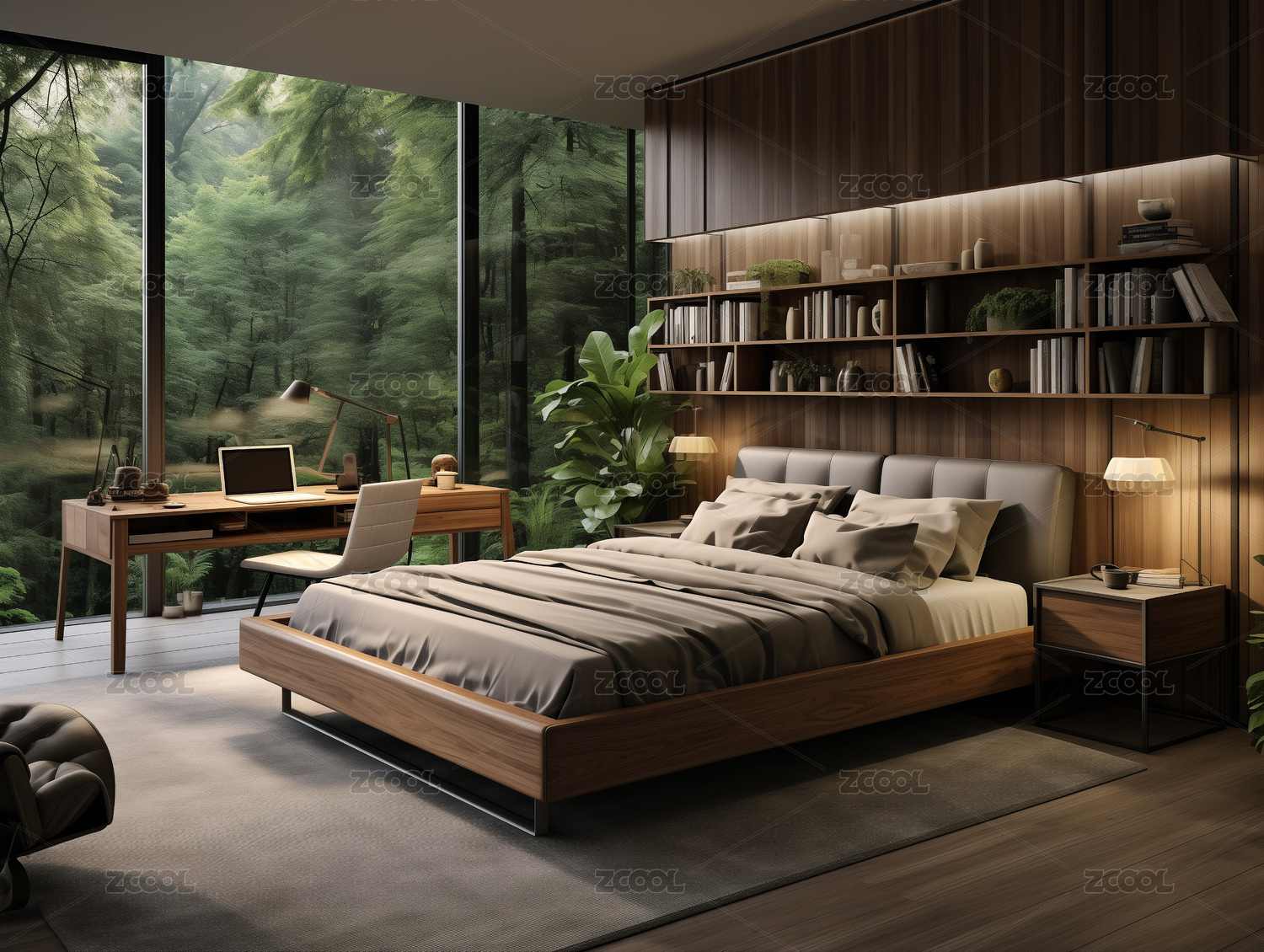 现代卧室室内设计木质墙壁和大窗户俯瞰花园