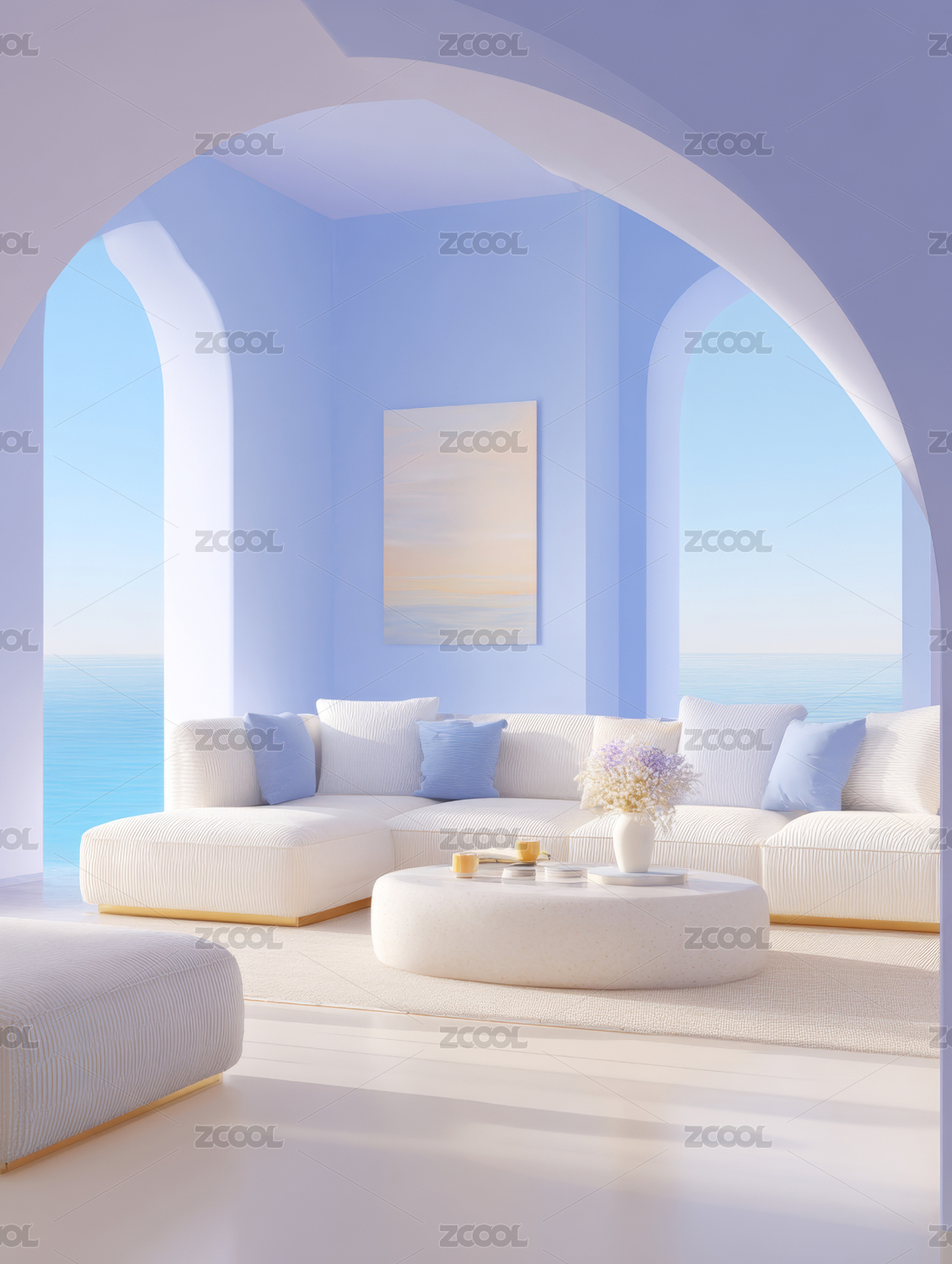 白色,浅蓝色,大圆形拱门,房间,拱门,开放式阳台,阳台,白色沙发,沙发,抱枕