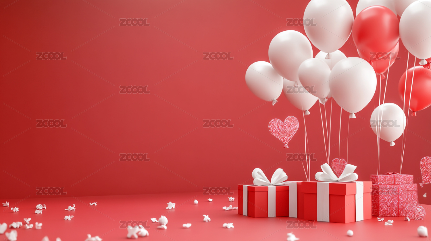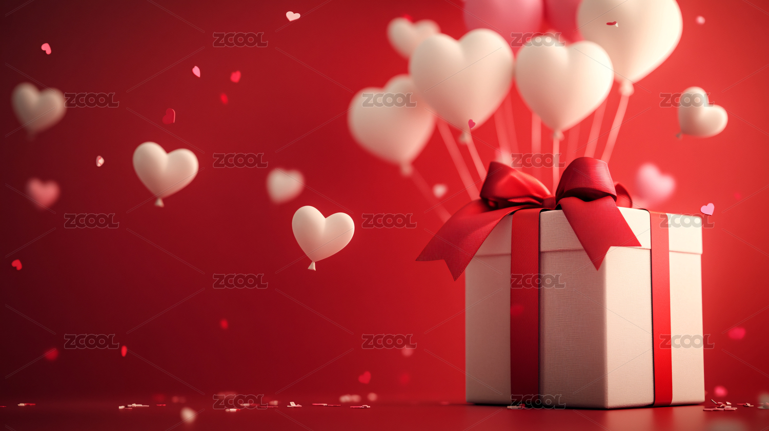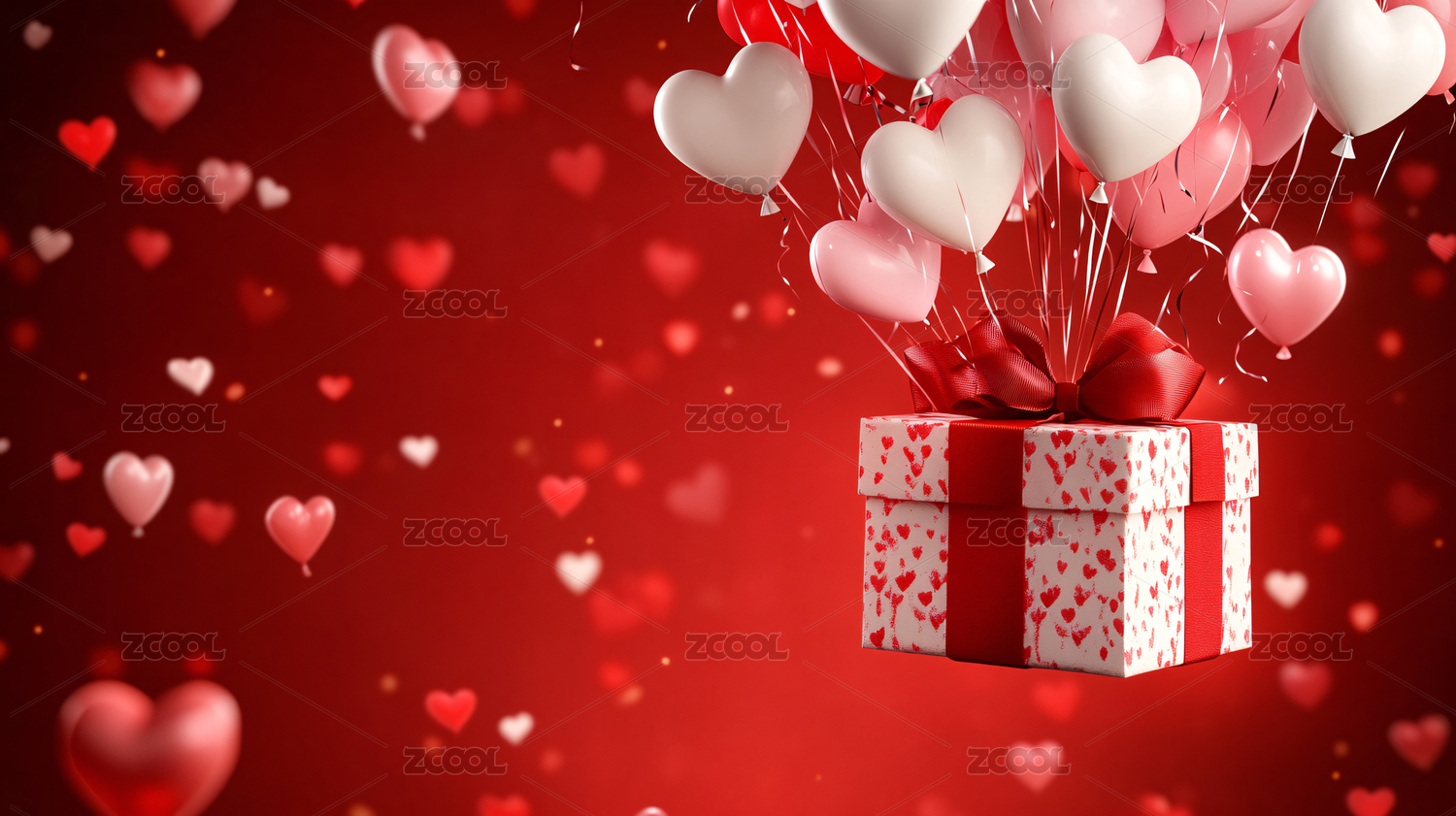情人节漂浮的礼盒和爱心气球