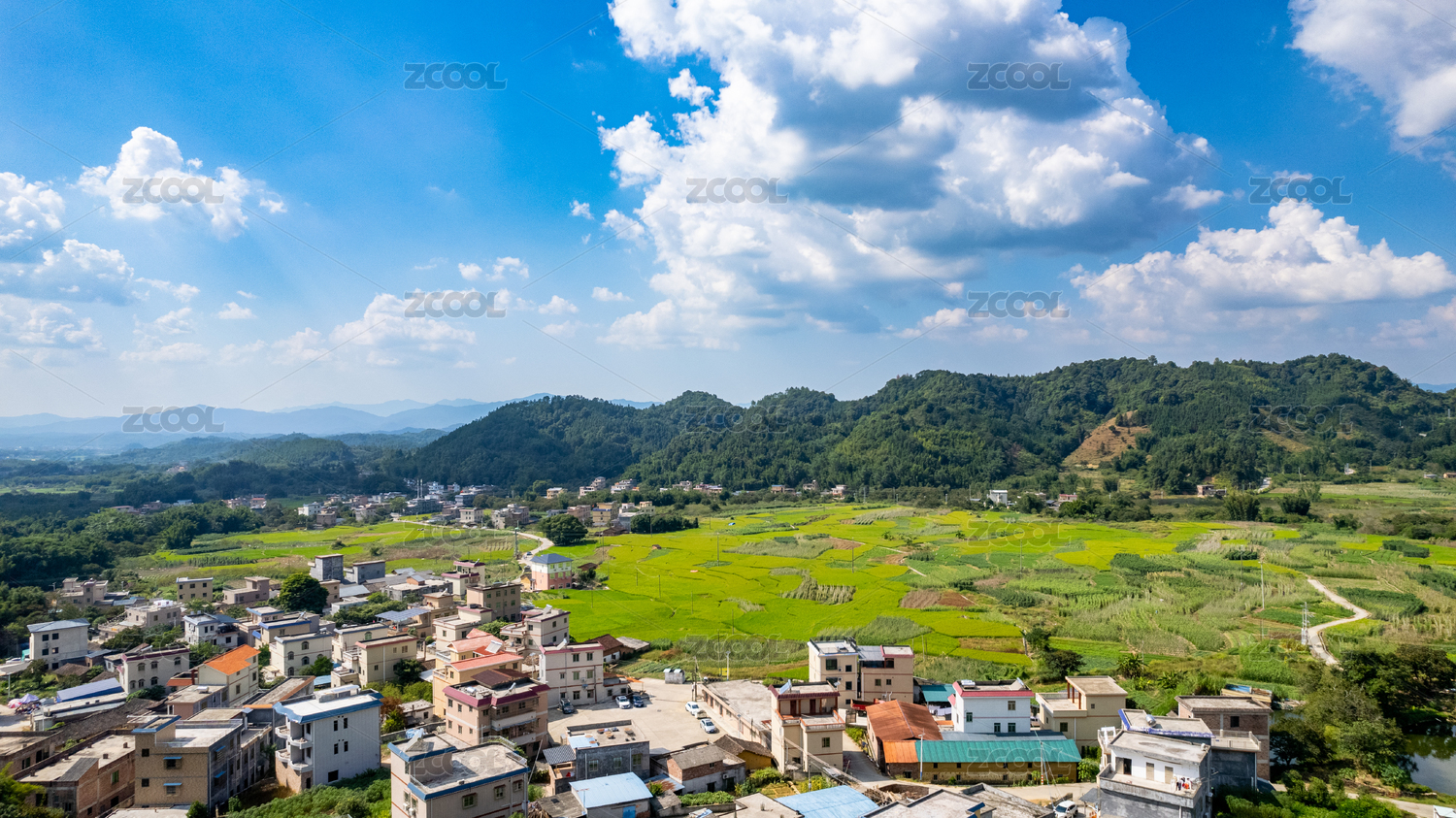 秋季成熟的稻田田园村庄景观背景