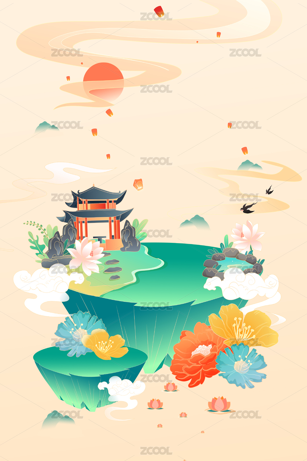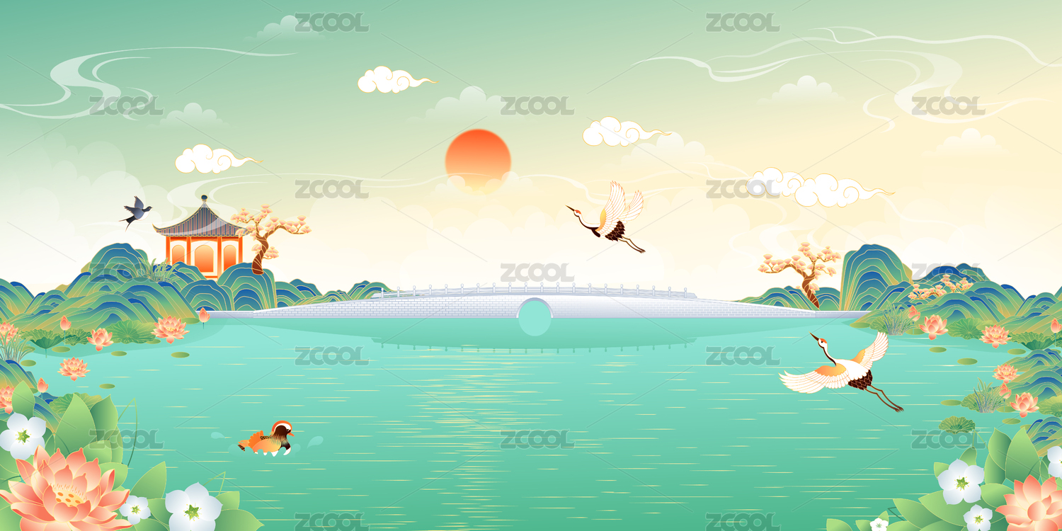 国潮风山水风景矢量插画