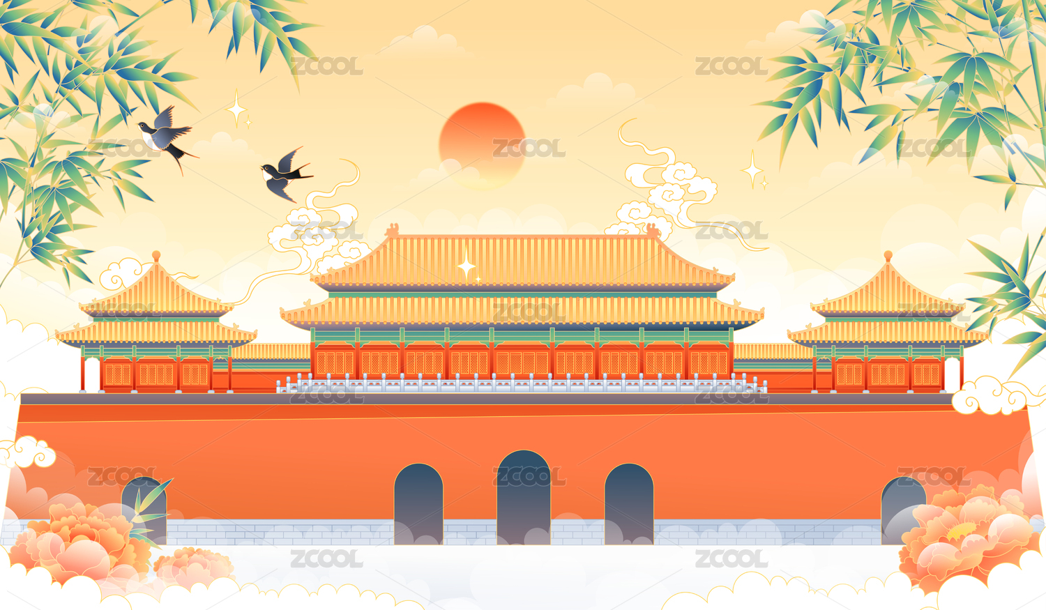 北京故宫国潮喜庆节日中秋古建孔明灯插画