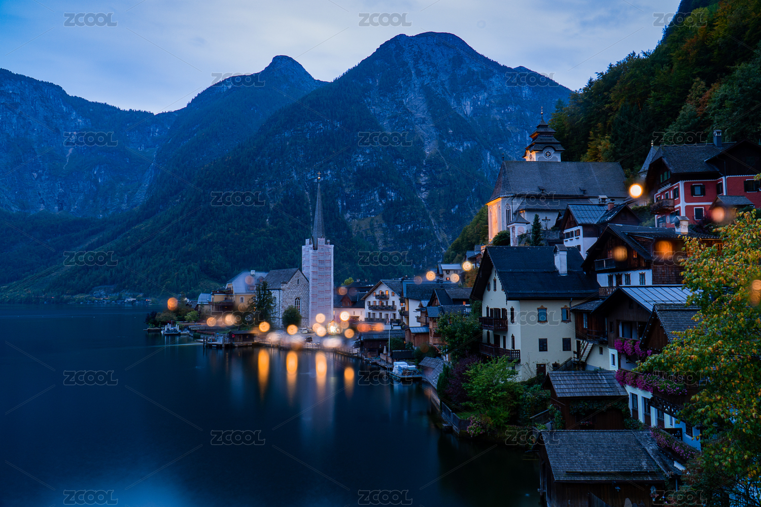 欧洲奥地利哈尔施塔特小镇湖光山色夜景